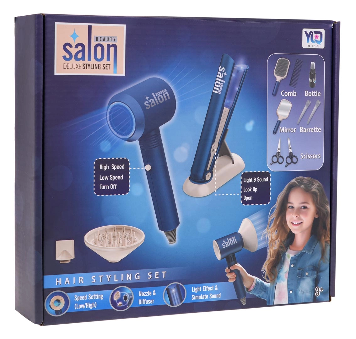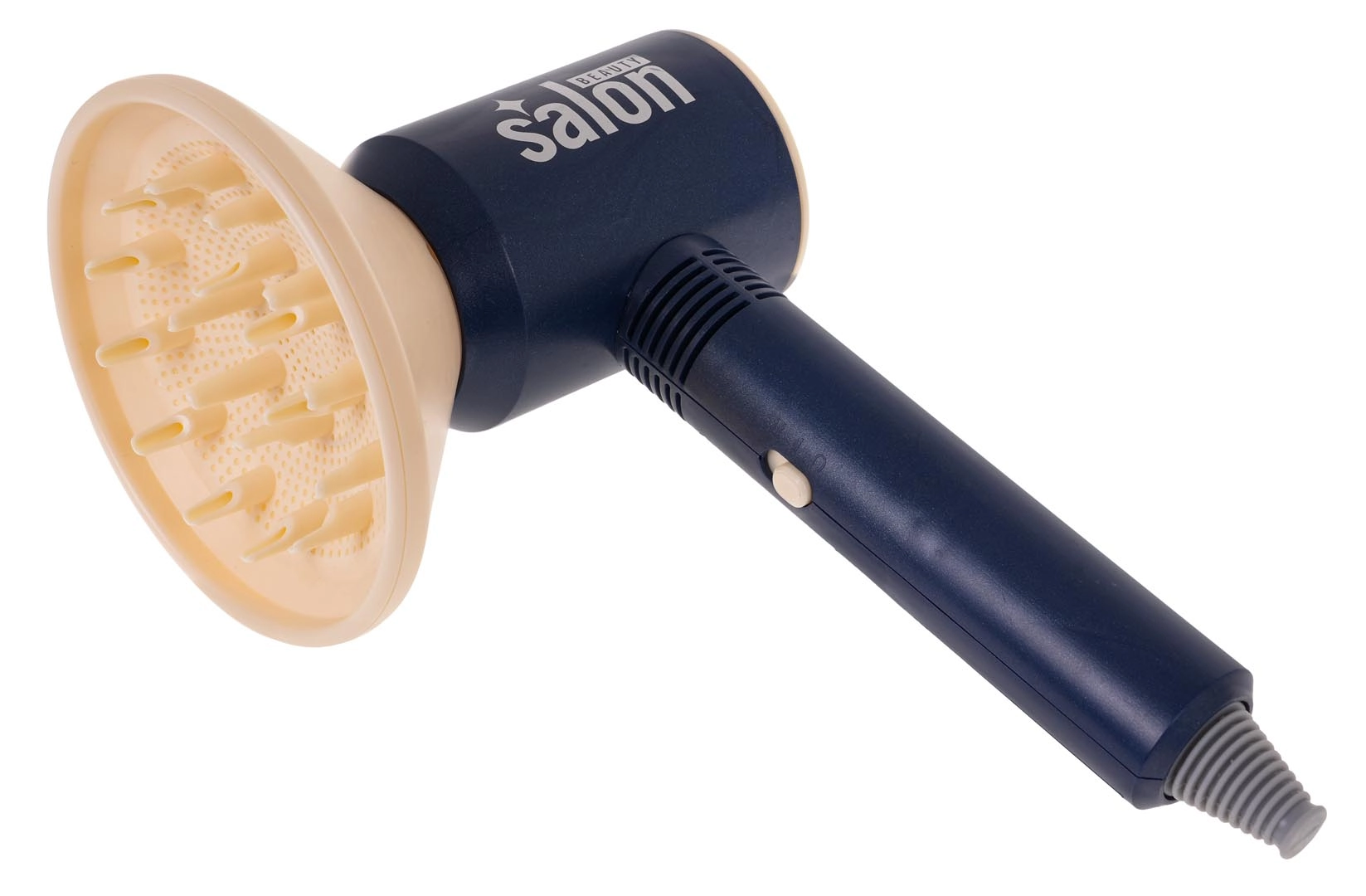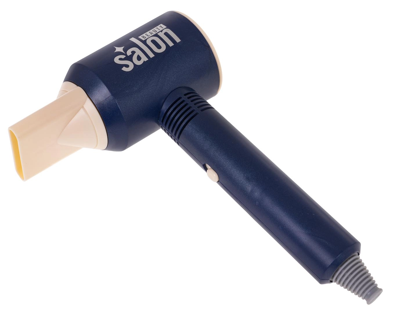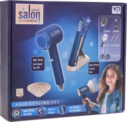 Αυτό το πλούσια εξοπλισμένο κομμωτικό σετ σε μπλε χρώμα προσφέρει στα παιδιά ώρες διασκέδασης και φαντασίας. Ο πρωταγωνιστής είναι το σεσουάρ μπαταρίας με εναλλάξιμα ακροφύσια, που φυσά πραγματικά και ακούγεται σαν αληθινό. Το ισιωτικό φωτίζει και παράγει ρεαλιστικούς ήχους, κάνοντας το παιχνίδι κομμωτηρίου αυθεντικό.