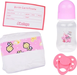 Περιλαμβάνονται μπιμπερό, μαγνητική πιπίλα, πάνα και πιστοποιητικό γέννησης – όλα για ρεαλιστική φροντίδα του μωρού.