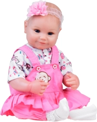 Αυτή η χαριτωμένη κούκλα μωρό είναι φτιαγμένη από ποιοτικά υλικά με έμφαση στη λεπτομέρεια – διαθέτει μαλακό σώμα, λαστιχένια κινητά χεράκια και ποδαράκια και ρεαλιστικά χαρακτηριστικά προσώπου με μπλε μάτια και μακριές βλεφαρίδες. Το κεφάλι έχει βαμμένα μαλλάκια, ιδανικό και για τις πιο μικρές φροντιστές. Το ρουχαλάκι σε ροζ τόνους με σχέδια ζωάκια και η λουλουδένια κορδέλα χαρίζουν απαλή και τρυφερή όψη.