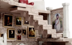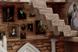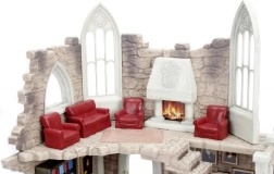 Μικρό μοντέλο δωματίου με αρχαία πέτρα και γοτθικά τοξωτά παράθυρα. Οι κόκκινες πολυθρόνες γύρω από το τζάκι τονίζουν το γοτθικό ύφος.