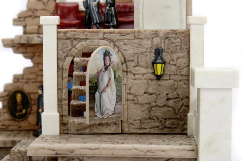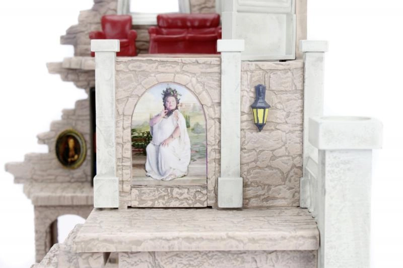 Πέτρινη μινιατούρα κάστρου με κίονες και μια μικρή εξωτερική λάμπα, κατάλληλη για έκθεση ή παιχνίδι.