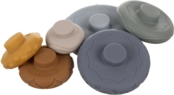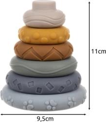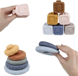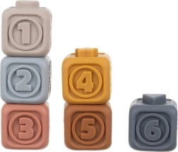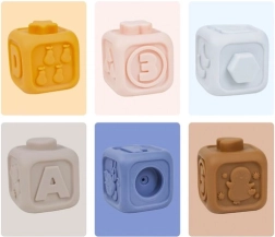Διατίθενται 6 μαλακοί κύβοι και δακτύλιοι που παράγουν απαλούς ήχους και έχουν διαφορετικές υφές, υποστηρίζοντας την ανάπτυξη των αισθήσεων και των κινητικών δεξιοτήτων.