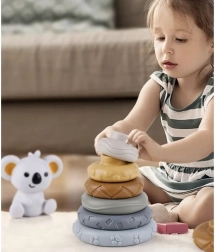 Εκτός από 13 αισθητηριακά στοιχεία και κύβους, το σετ περιλαμβάνει επίσης ένα χαριτωμένο παιχνιδάκι σε σχήμα κοάλα, που μπορεί να τοποθετηθεί πάνω στους κύβους, προσθέτοντας διασκέδαση. Κάθε στοιχείο του σετ έχει σχεδιαστεί ώστε να προσφέρει στο παιδί ποικίλα αισθητηριακά και ηχητικά ερεθίσματα χάρη στα ανάγλυφα μοτίβα και τους απαλούς ήχους που παράγουν οι κύβοι κατά τον χειρισμό.