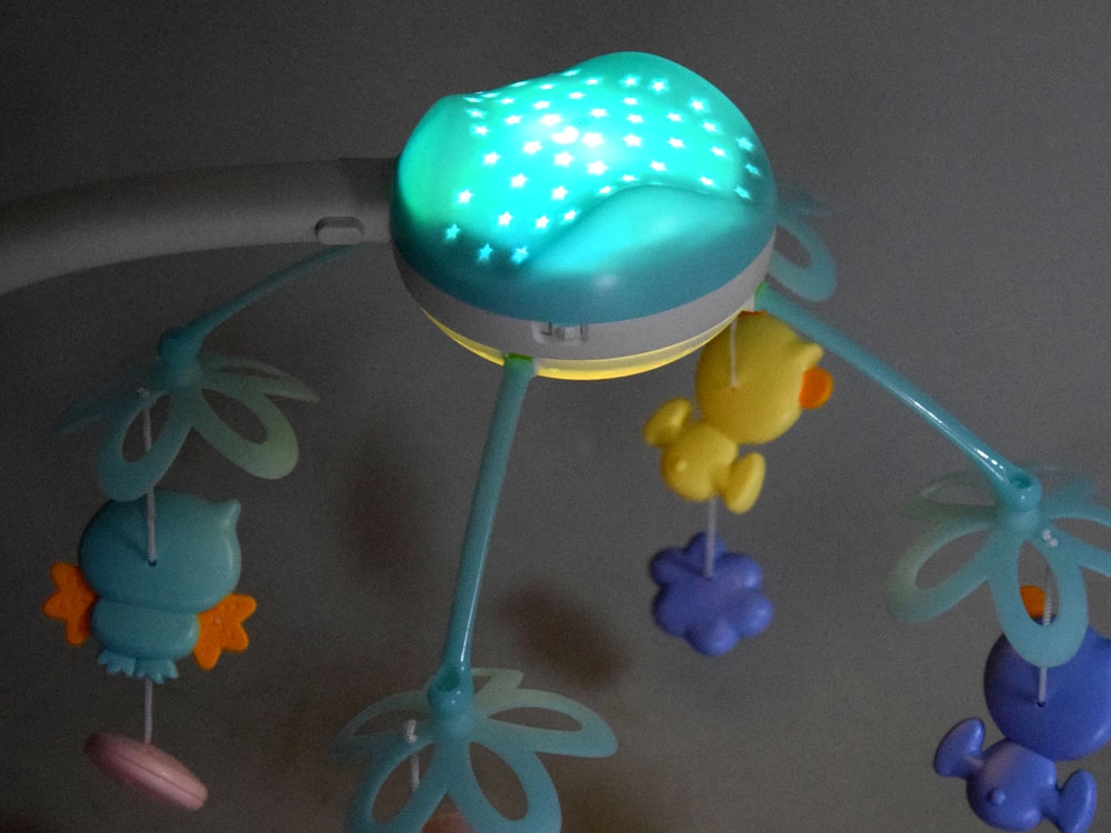 Το καρουζέλ έχει σχεδιαστεί για να υποστηρίζει χαλάρωση και αισθητηριακή ανάπτυξη από τη γέννηση. Ο ενσωματωμένος προβολέας προβάλλει στο ταβάνι και τους τοίχους απαλά αστεράκια, ενώ το ενσωματωμένο μουσικό κουτί παίζει μελωδίες, νανουρίσματα, ήχους φύσης και ζωάκια. Χάρη στο τηλεχειριστήριο μπορείτε να ενεργοποιείτε ή να χαμηλώνετε το καρουζέλ ακόμα και από το διπλανό δωμάτιο.