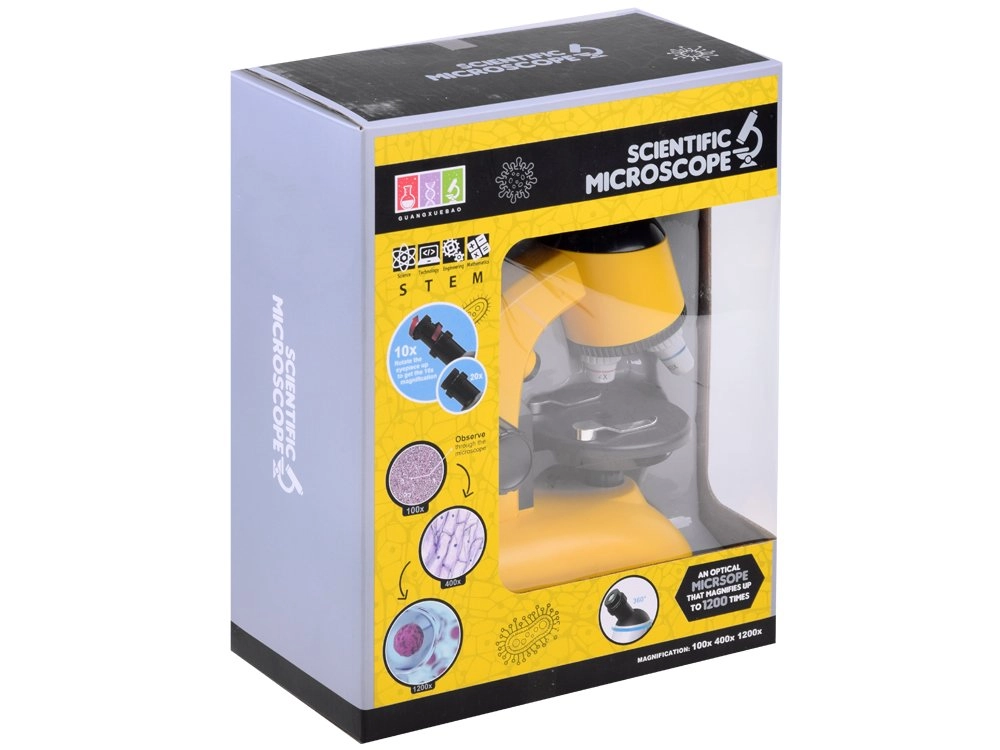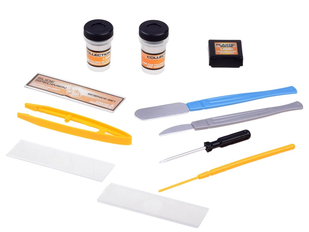 Στη συσκευασία περιλαμβάνονται πλούσια αξεσουάρ: έτοιμο πλακίδιο, κενές αντικειμενοφόρες πλάκες, δοχεία δειγμάτων, τσιμπιδάκι, σπάτουλα, σταγονόμετρο, νυστέρι και βελόνα – όλα όσα χρειάζεται το παιδί για ασφαλή και διασκεδαστική εξερεύνηση μικρών αντικειμένων.