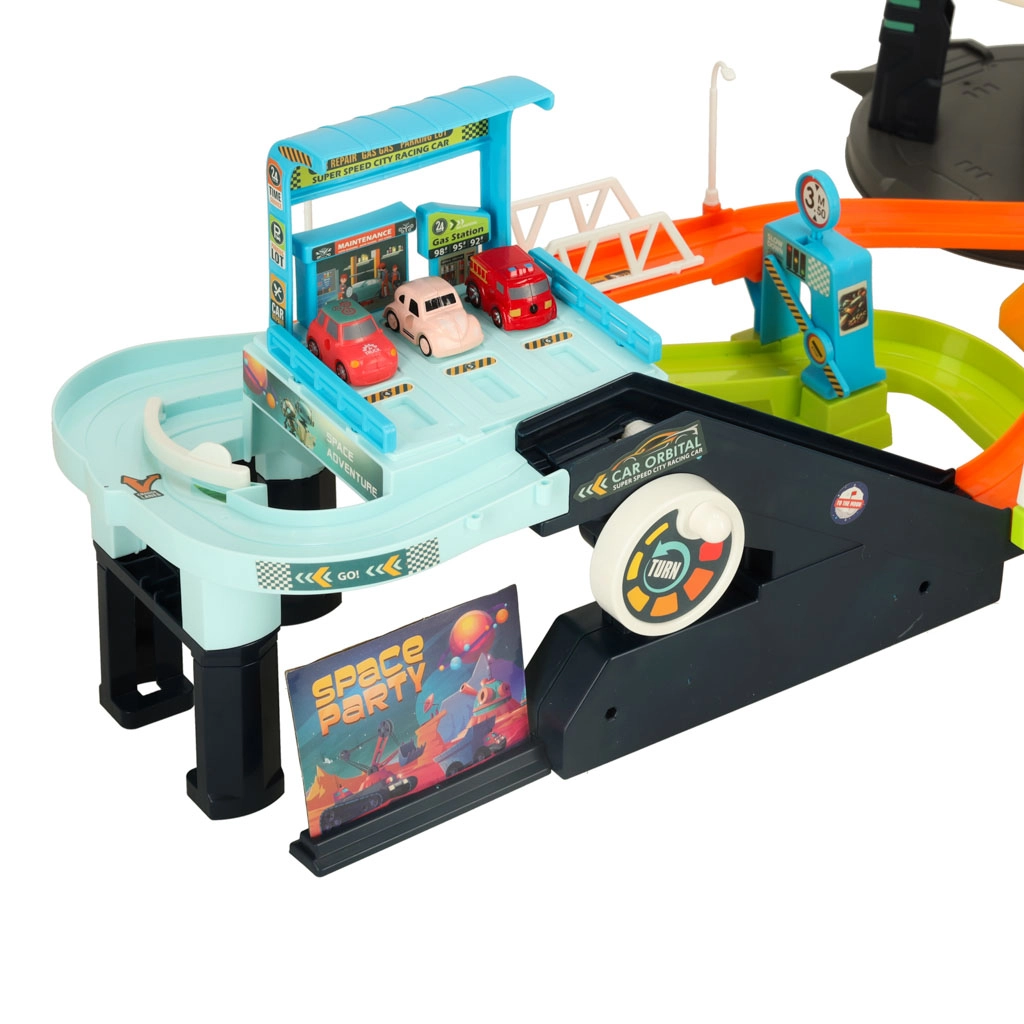 Βυθιστείτε σε ένα διαστημικό βασίλειο γεμάτο περιπέτεια, όπου η πίστα προσφέρει δύο διαφορετικές διαμορφώσεις - τα παιδιά μπορούν να δημιουργήσουν ξεχωριστές πίστες ή να τις ενώσουν σε μία μακριά διαδρομή γεμάτη στροφές και κατηφόρες. Ο προσεγμένος σχεδιασμός ενισχύει τη δημιουργικότητα και επιτρέπει διάφορα σενάρια παιχνιδιού.