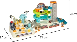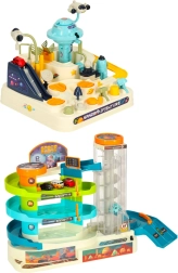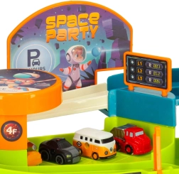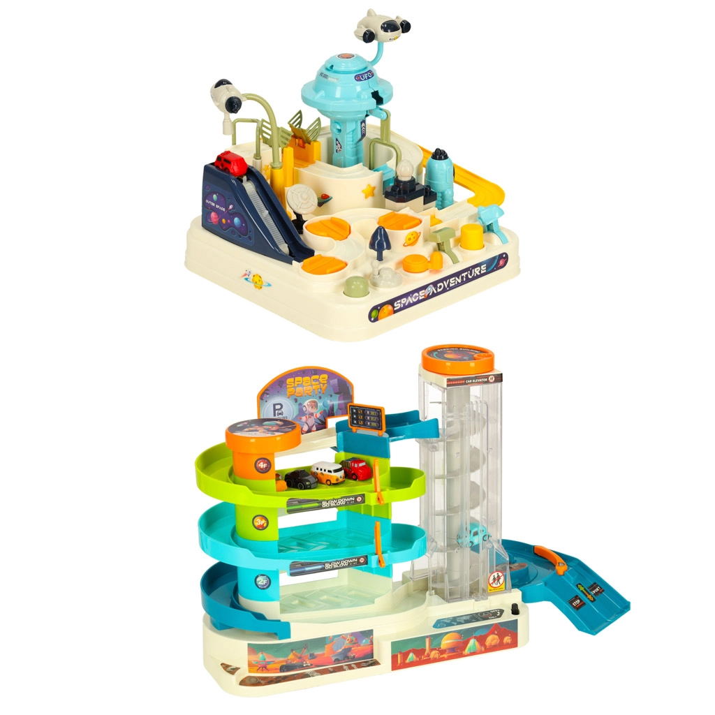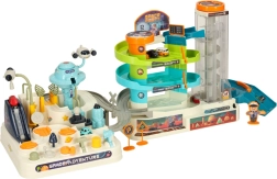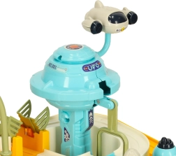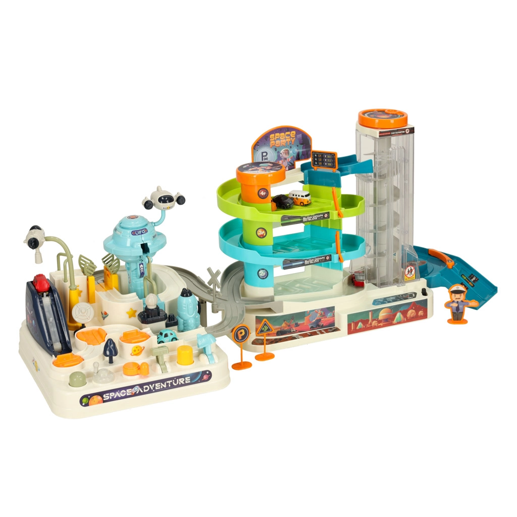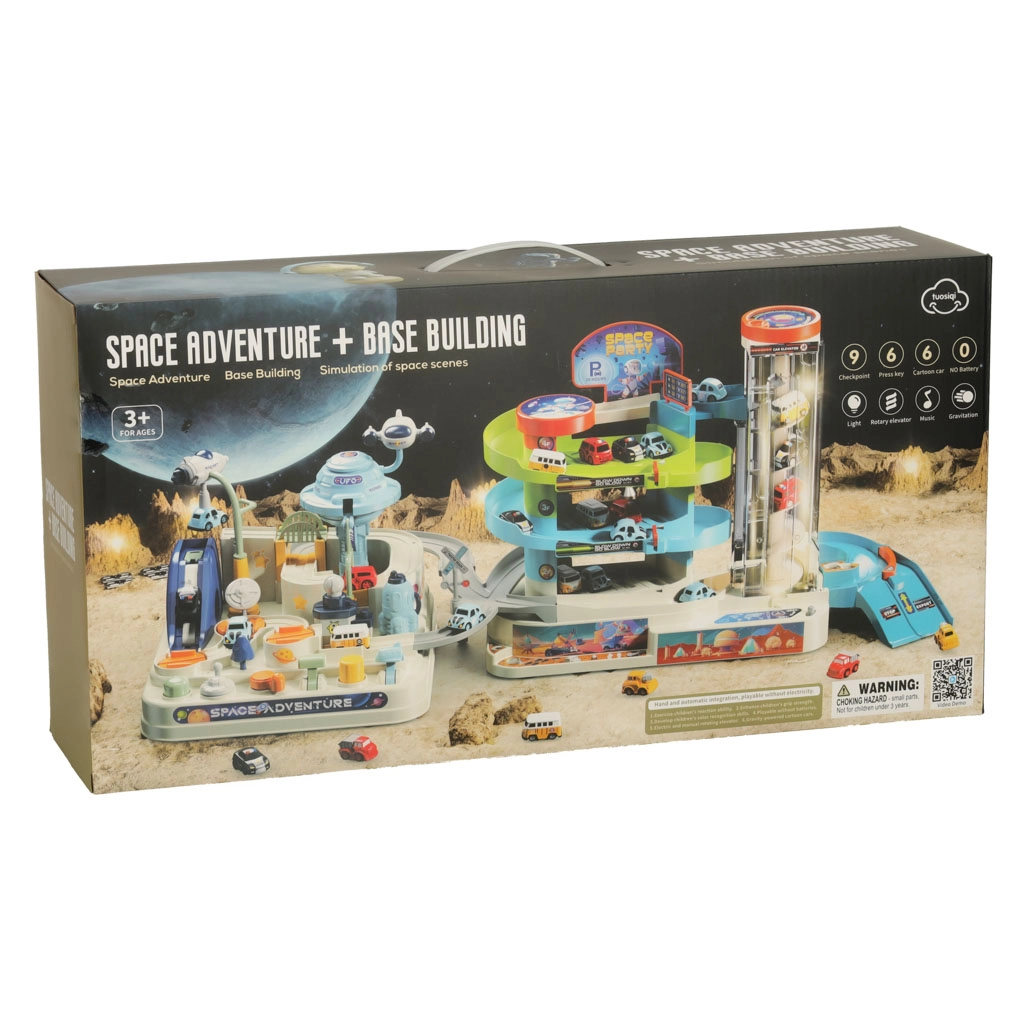Η πολυχρηστική διαστημική αυτοκινητόπιστα προσφέρει διπλό ενθουσιασμό και δυνατότητες παιχνιδιού. Χάρη στις δύο διαδρομές της, μπορείτε να δημιουργήσετε δύο μικρότερους γύρους ή να τους ενώσετε σε έναν μεγάλο και να παρακολουθείτε τα μικρά αυτοκινητάκια να ορμούν στο διαστημικό τοπίο. Η μεγάλη πίστα διαθέτει ηλεκτρικό ανελκυστήρα που μεταφέρει αυτόματα τα αυτοκίνητα στην κορυφή, εξασφαλίζοντας αδιάκοπη διασκέδαση. Η μικρότερη πίστα περιλαμβάνει διαδραστικά στοιχεία που το παιδί χειρίζεται μόνο του, ενισχύοντας και αναπτύσσοντας τις χειρονακτικές του δεξιότητες. Στη συσκευασία περιλαμβάνονται έξι οχήματα, συμπεριλαμβανομένων περιπολικού και μπετονιέρας, για ποικίλη διασκέδαση.