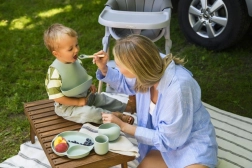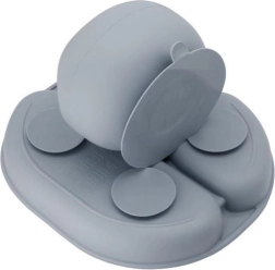 Χάρη στις αντιολισθητικές βεντούζες, τα μπολ και τα πιάτα παραμένουν στη θέση τους, μειώνοντας τον κίνδυνο ακαταστασίας κατά τη διάρκεια των γευμάτων. Το χωρισμένο πιάτο βοηθά επιπλέον τα παιδιά να κατανοούν ευκολότερα τους βασικούς κανόνες μερίδων και διαχωρισμού των τροφών. Η απαλή σιλικονούχα ποδιά με βαθιά τσέπη προστατεύει αποτελεσματικά τα ρούχα από τους λεκέδες.