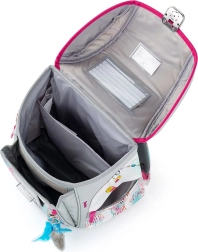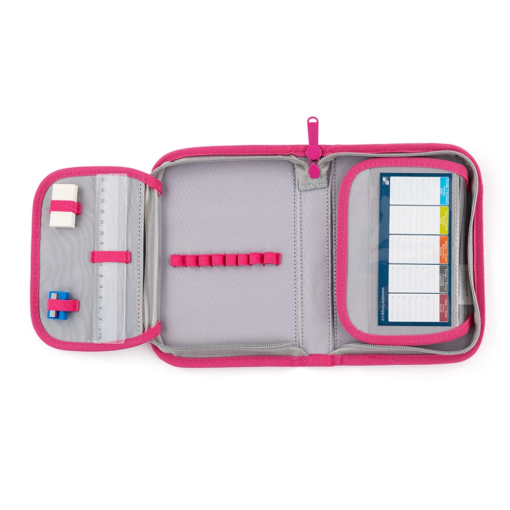 Η μελετημένη διαρρύθμιση προσφέρει αρκετό χώρο για βιβλία, τετράδια και κολατσιό. Ο εσωτερικός διαχωριστής, οι πολλές τσέπες και οι θήκες με φερμουάρ διατηρούν την τάξη όλη τη σχολική ημέρα. Περιλαμβάνεται επίσης πρακτικός σάκος για γυμναστική με κορδόνια σύσφιξης και κασετίνα μονής θήκης με δύο πτερύγια και λαστιχάκια.