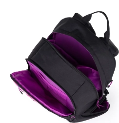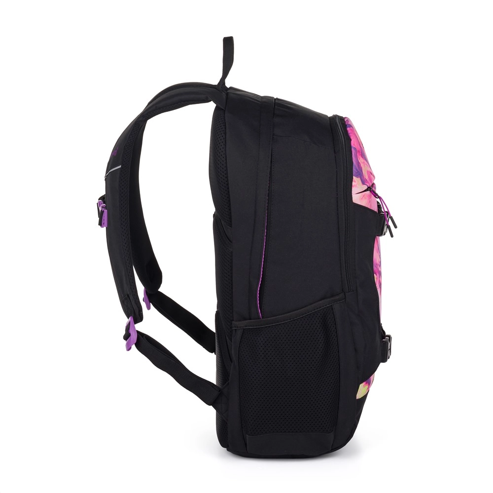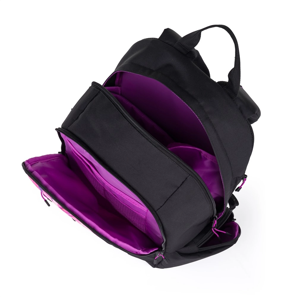 Ο εσωτερικός οργανωτής με καραμπίνερ, η επενδεδυμένη θήκη για laptop και η κρυφή τσέπη στην πλάτη εξασφαλίζουν τάξη και προστασία των προσωπικών αντικειμένων. Οι δύο μπροστινές πόρπες και οι πλαϊνές τσέπες προσφέρουν επιπλέον επιλογές στερέωσης και γρήγορη πρόσβαση. Ο μοντέρνος, ευέλικτος σχεδιασμός με μαρμαροειδές μοτίβο σε ροζ-μωβ τόνους ταιριάζει στο σχολείο, το γραφείο και τις εκδρομές.