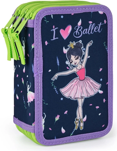 Κομψή τριώροφη κασετίνα με μοτίβο μπαλαρίνας, ιδανική για μαθητές. Προσφέρει 40 ελαστικές θηλές για οργανωμένη αποθήκευση γραφικών ειδών, ανθεκτικό φερμουάρ με μεγάλους δρομείς για εύκολο άνοιγμα και διάφανη θήκη για το εβδομαδιαίο πρόγραμμα.