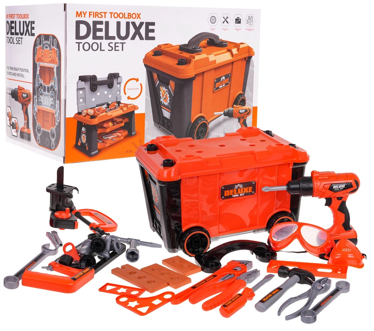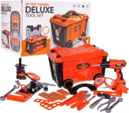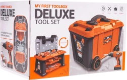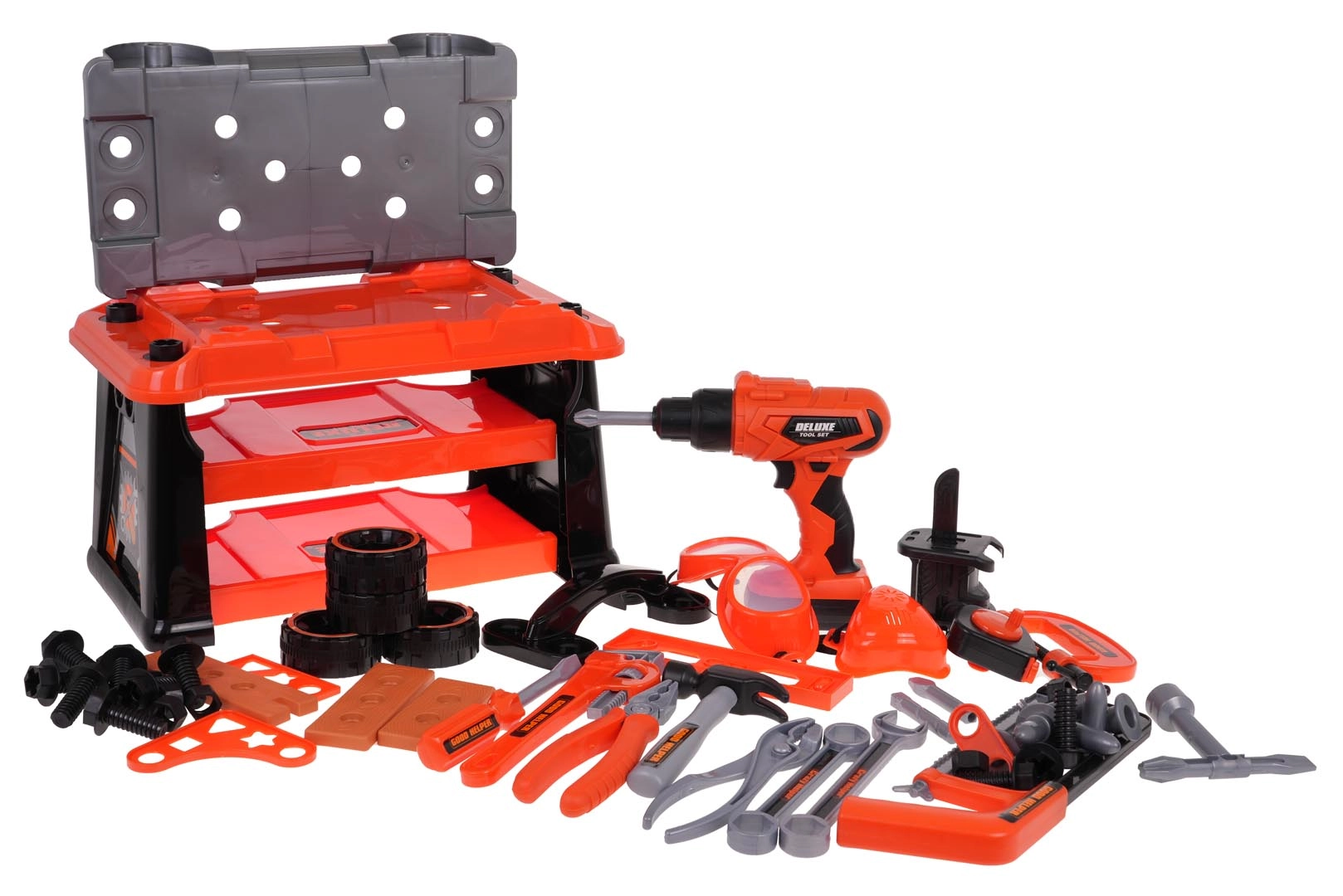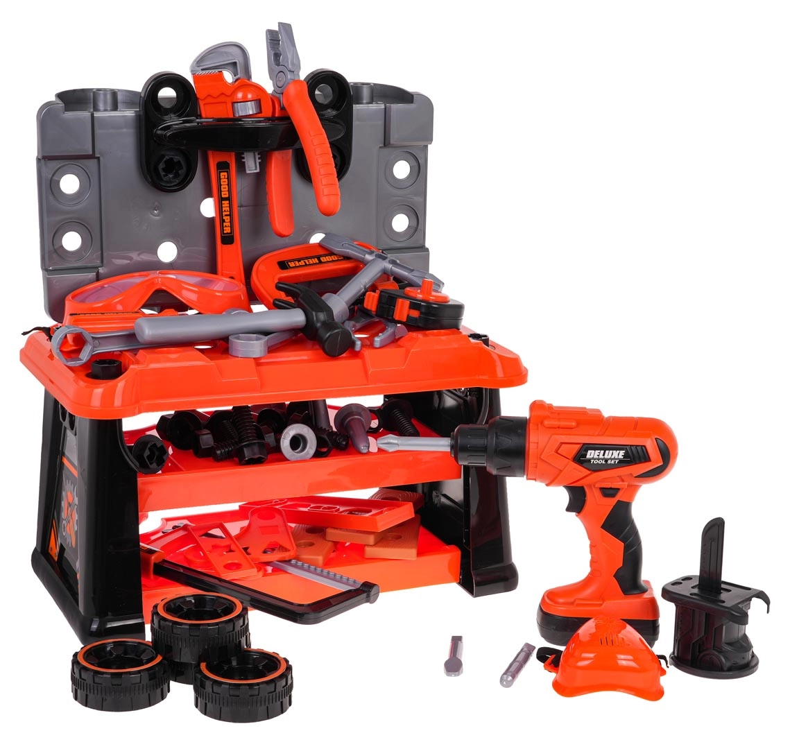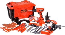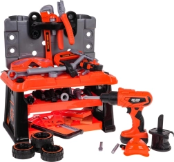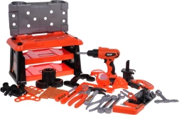 Αυτό το πλούσια εξοπλισμένο σετ προσφέρει στα παιδιά μια ρεαλιστική εμπειρία εργαστηρίου. Στήνετε εύκολα έναν σταθερό πάγκο εργασίας και μετά το παιχνίδι αποθηκεύετε τα πάντα στη φορητή βαλίτσα με ροδάκια. Ο πρωταγωνιστής είναι το ηλεκτρικό τρυπάνι/κατσαβίδι με ανταλλακτικές μύτες και προσαρμογέα με πριόνι, που μπορεί να βιδώνει και να ξεβιδώνει – όπως στην πραγματικότητα.