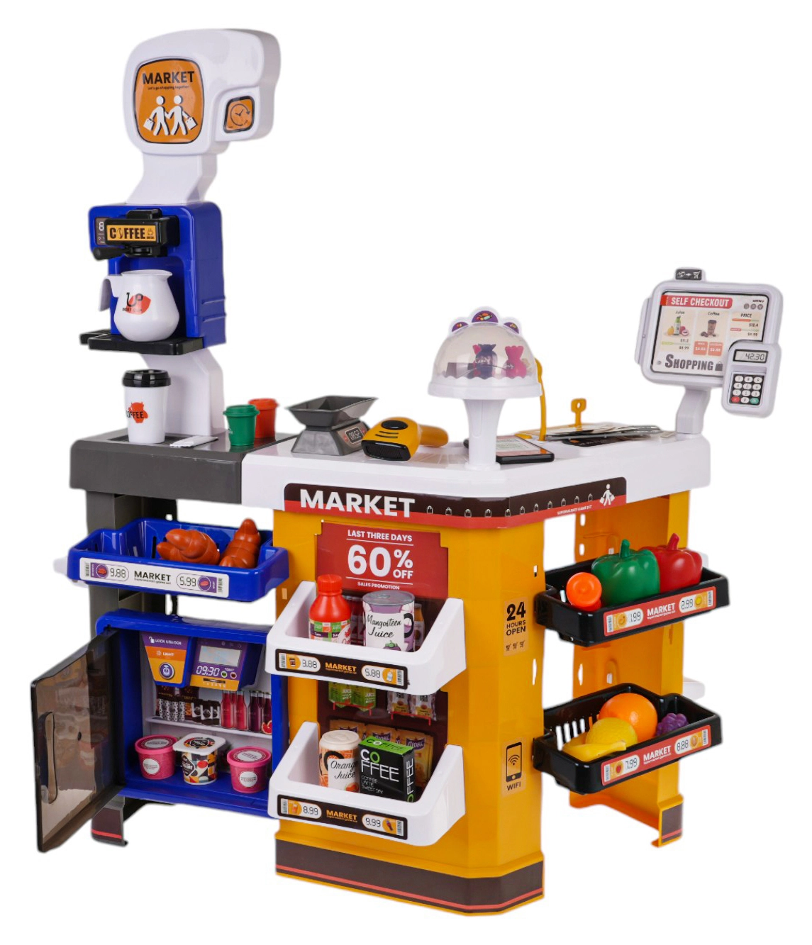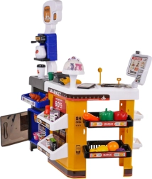 Αυτό το προσεγμένο παιδικό σούπερ μάρκετ μετατρέπει το δωμάτιο σε πραγματικό κατάστημα. Το σετ περιλαμβάνει ταμειακή με αναγνώστη καρτών, σαρωτή, μικρόφωνο, ζυγαριά, ανοιγόμενο ψυγείο, ράφια και πολλά ρεαλιστικά ομοιώματα τροφίμων. Χάρη στα φωτεινά και ηχητικά εφέ, το παιχνίδι γίνεται ακόμη πιο διασκεδαστικό και ενισχύει τη φαντασία και τις κοινωνικές δεξιότητες.