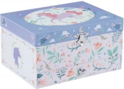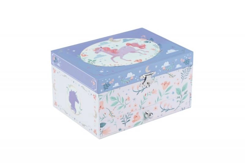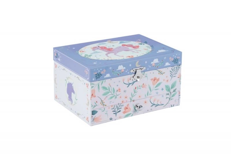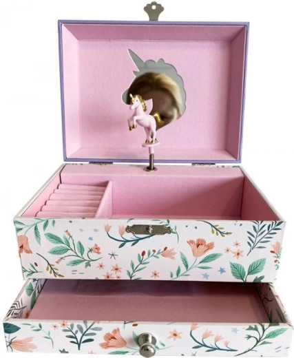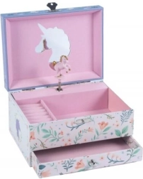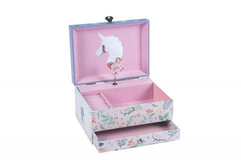 Η κοσμηματοθήκη με μουσικό μηχανισμό είναι το τέλειο δώρο για παιδιά που αγαπούν τα μαγικά και πρωτότυπα αξεσουάρ. Με το άνοιγμα του κουτιού, ακούγεται μια μελωδία και μαζί της αρχίζει να περιστρέφεται ο υπέροχος μονόκερος.