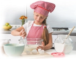 Ένα κορίτσι στην κουζίνα που μαθαίνει παιχνιδιάρικα στα παιδιά τα βασικά του ψησίματος και του μαγειρέματος.