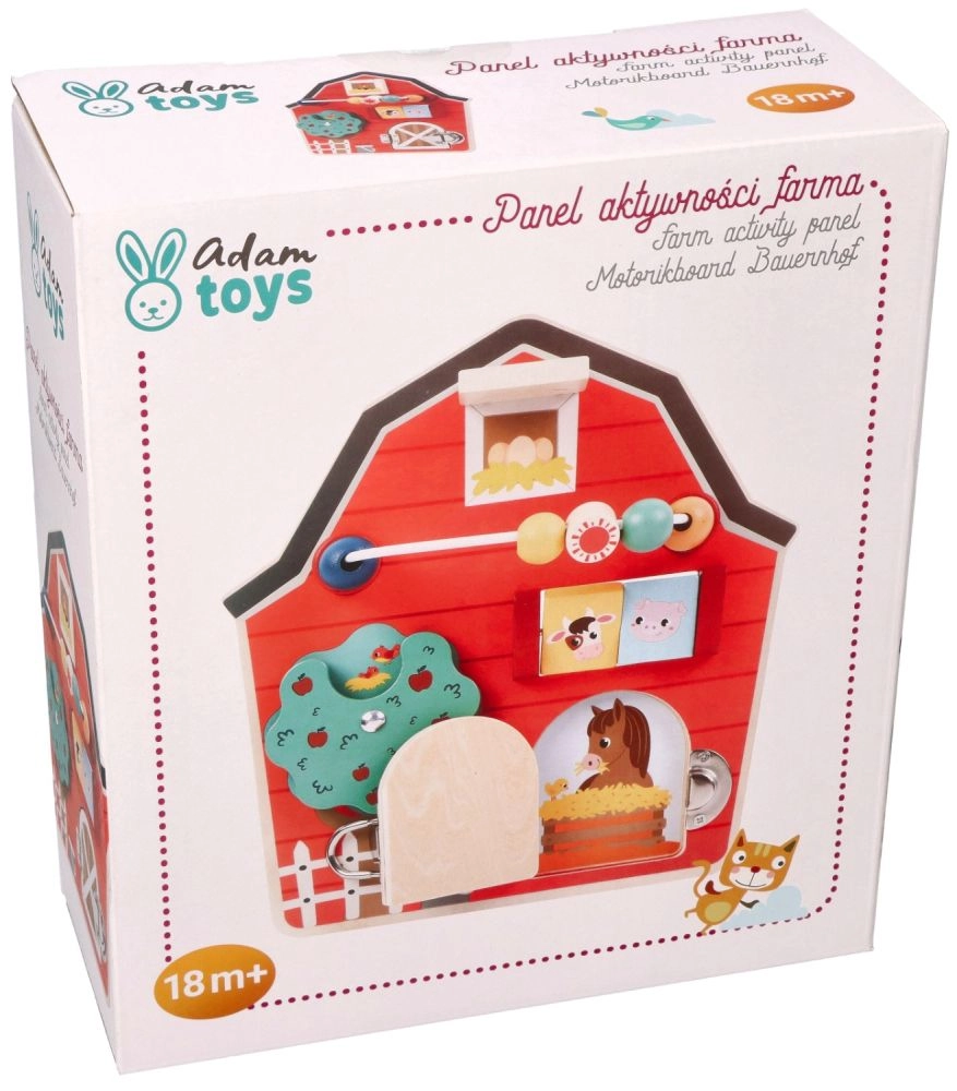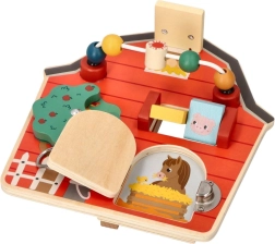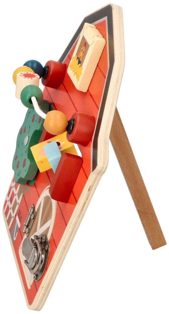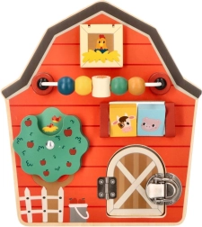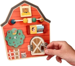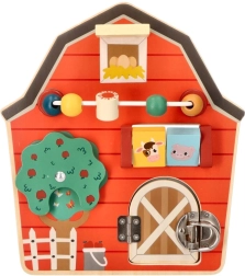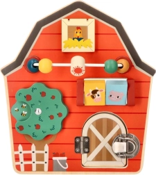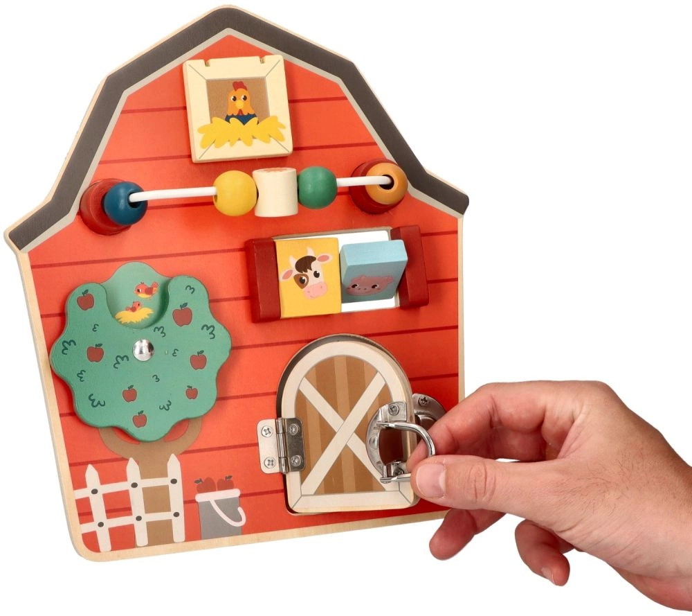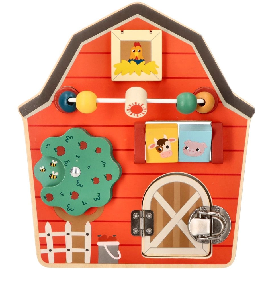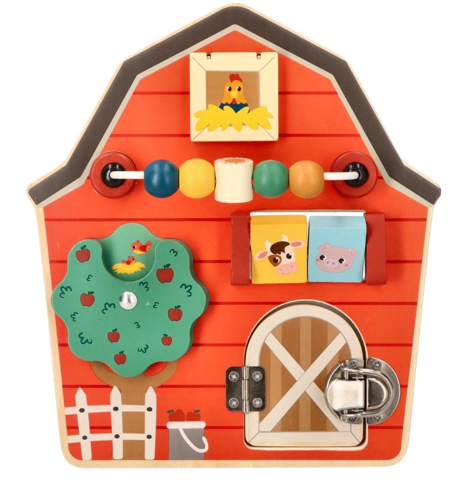 Αυτός ο ξύλινος διαδραστικός πίνακας σε σχήμα αχυρώνα έχει σχεδιαστεί για να ενθαρρύνει τη λεπτή κινητικότητα και τη διασκέδαση των παιδιών. Με το πολύχρωμο αγροτικό θέμα και τις αποχρώσεις του, όχι μόνο εκπαιδεύει αλλά και ψυχαγωγεί τα μικρότερα μέλη της οικογένειας. Διαδραστικά στοιχεία όπως συρόμενες χάντρες, περιστρεφόμενο δέντρο και πορτάκια με μάνταλο βοηθούν στην ανάπτυξη του συντονισμού χεριού-ματιού.