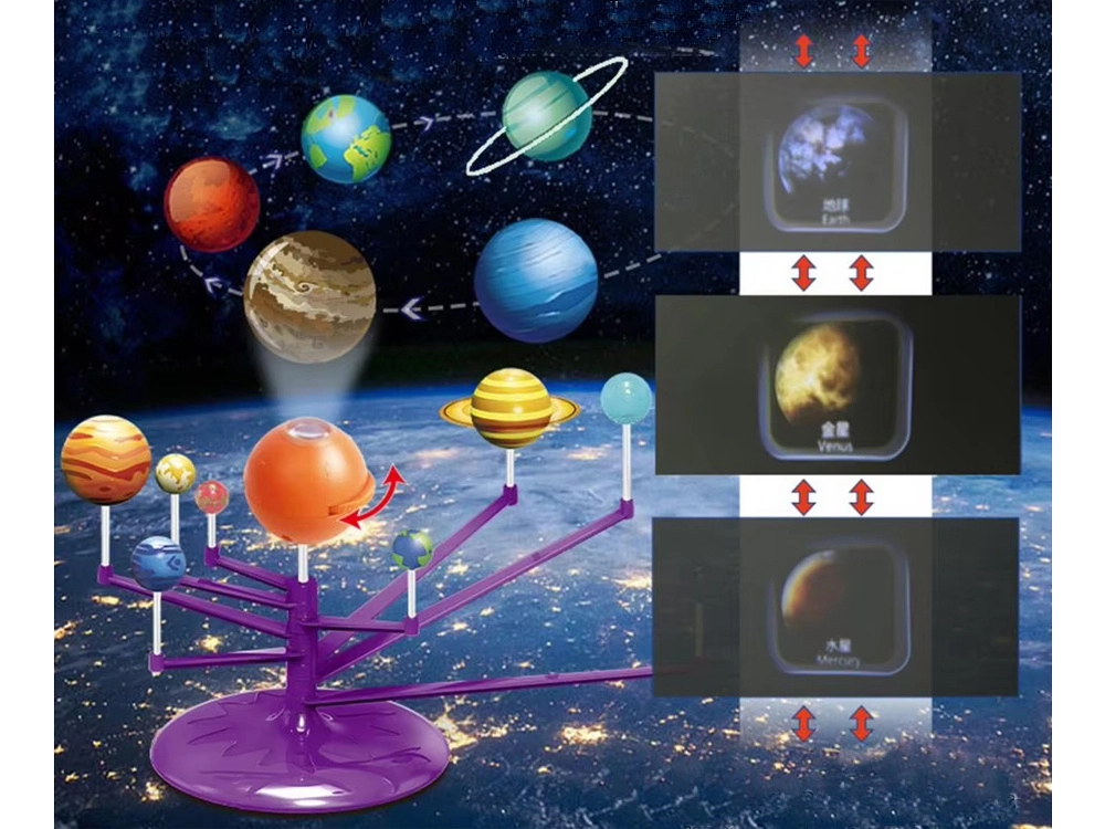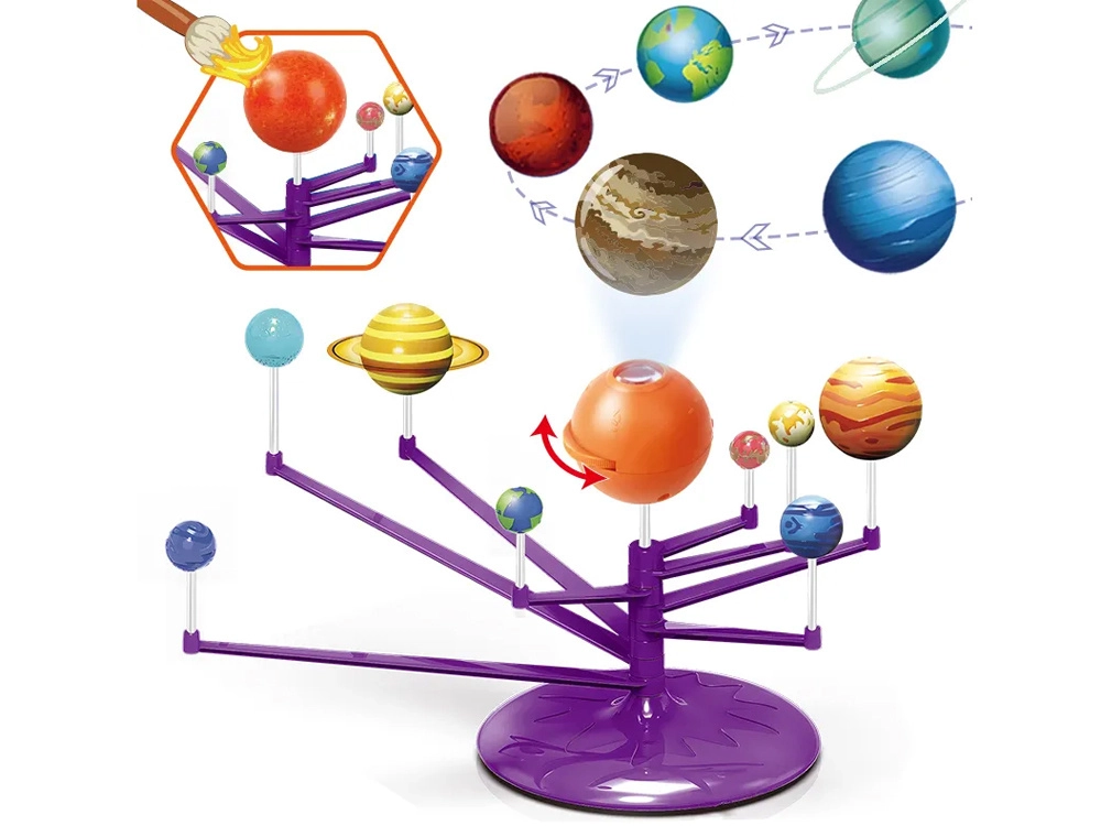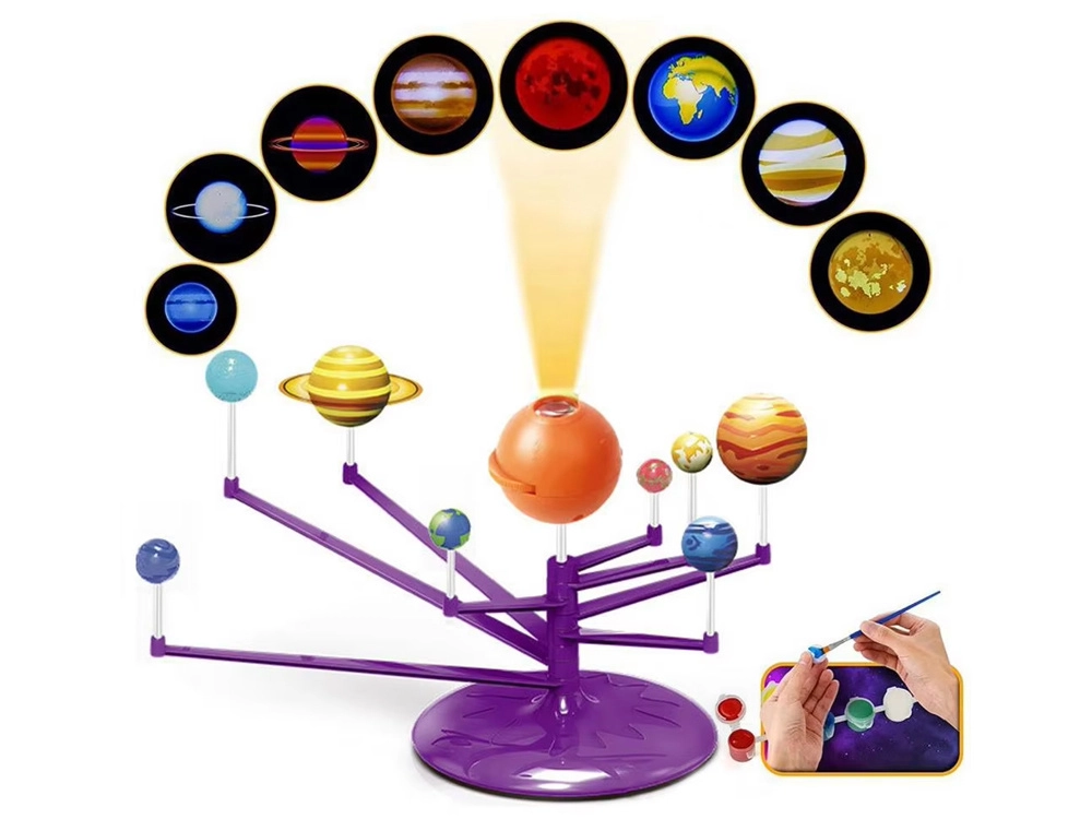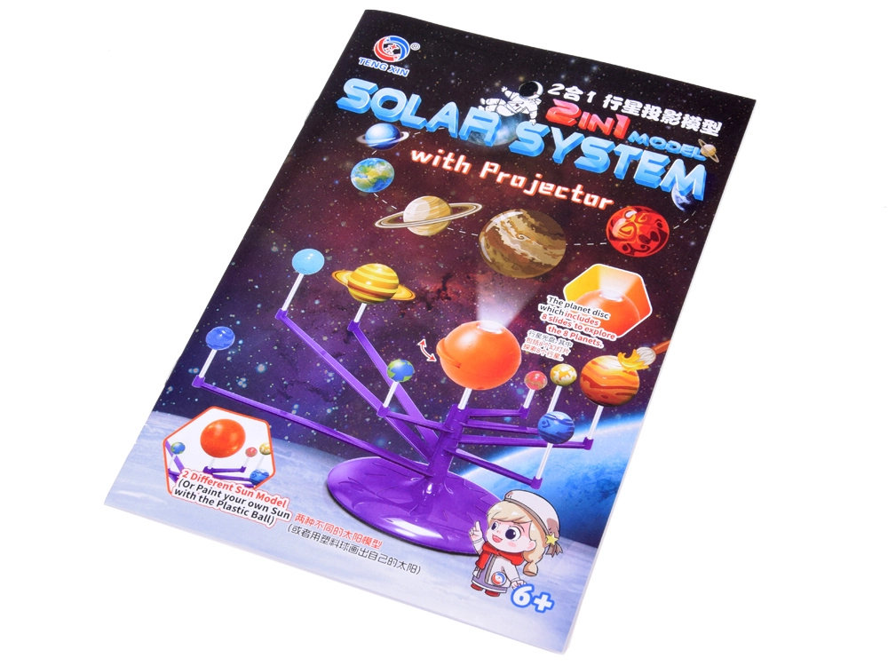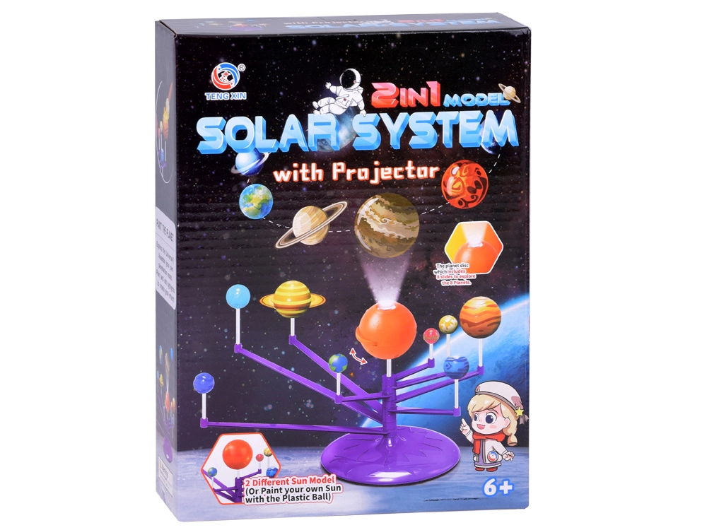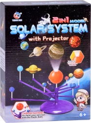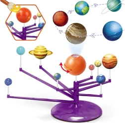 Μίνι μοντέλο Ηλιακού Συστήματος 2 σε 1 είναι ένα διαδραστικό, δημιουργικό και εκπαιδευτικό παιχνίδι που επιτρέπει στα παιδιά να συναρμολογούν και να ζωγραφίζουν μόνα τους τους πλανήτες. Περιλαμβάνει ένα πορτοκαλί σφαιρίδιο που αναπαριστά τον Ήλιο με προβολέα, ο οποίος προβάλλει τους πλανήτες στο ταβάνι.