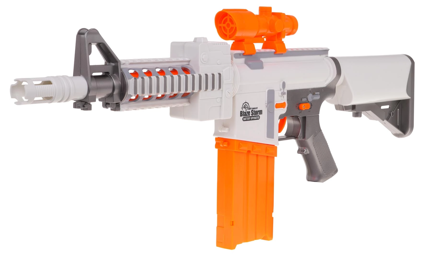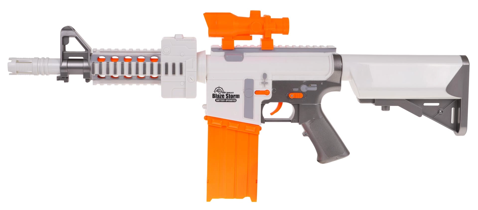 Απολαύστε συναρπαστική δράση με το blaster BLAZE STORM σε ελκυστικό λευκό–πορτοκαλί συνδυασμό. Χάρη στη ημιαυτόματη λειτουργία ρίχνετε βελάκι μετά το άλλο με ευκολία και με τον μεγάλο συρόμενο γεμιστήρα για 10 βλήματα η δράση διαρκεί. Το ρυθμιζόμενο σκοπευτικό βοηθά για ακριβέστερο σημάδι και τα αφρώδη βελάκια με μαλακή λαστιχένια άκρη είναι φιλικά κατά το παιχνίδι.