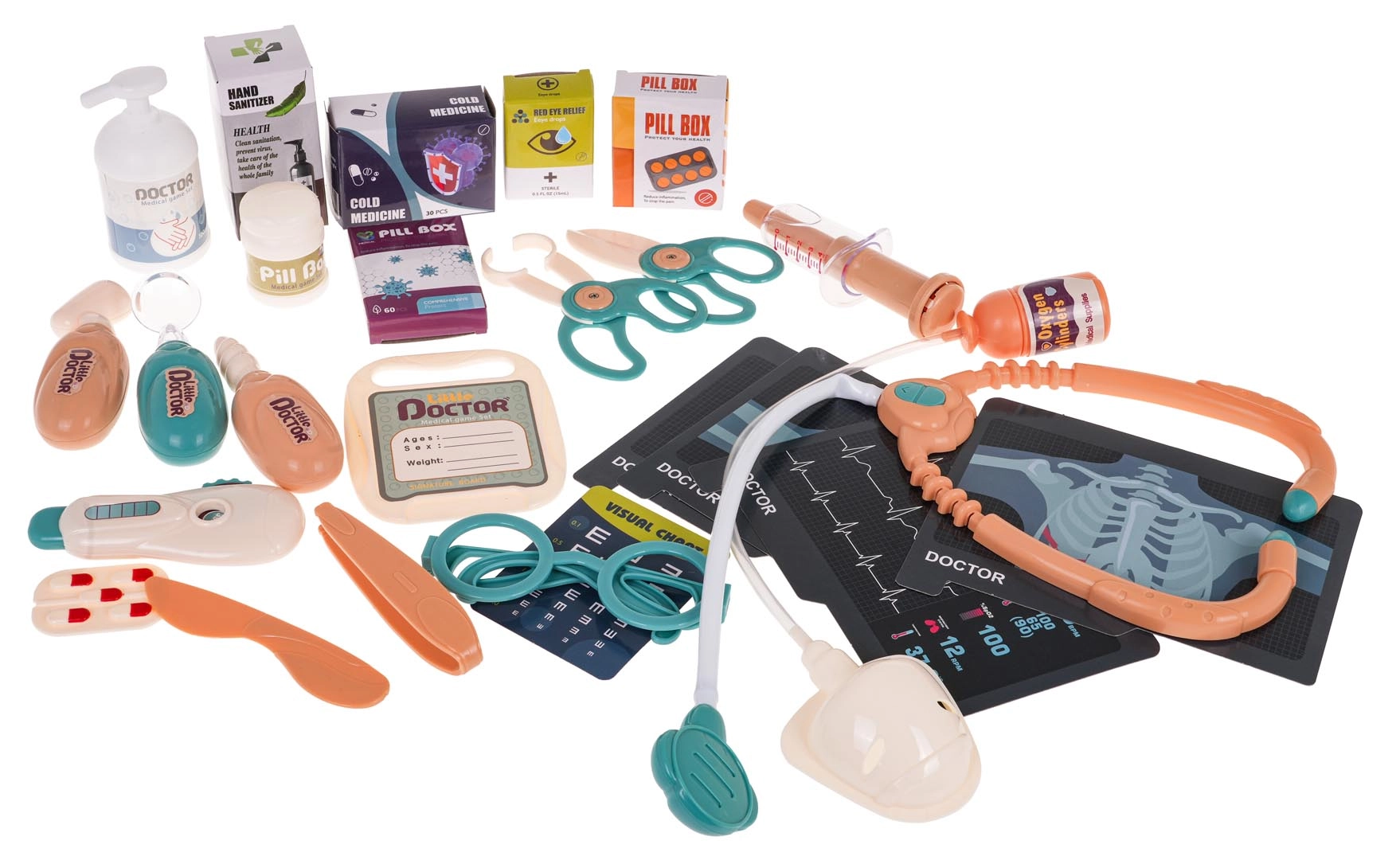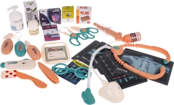 Το σετ περιλαμβάνει διάφορα ιατρικά εργαλεία όπως στηθοσκόπιο, θερμόμετρο, οδοντιατρικό καθρεφτάκι και άλλα.