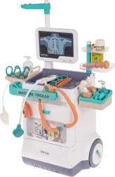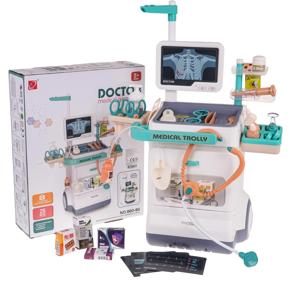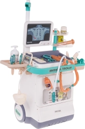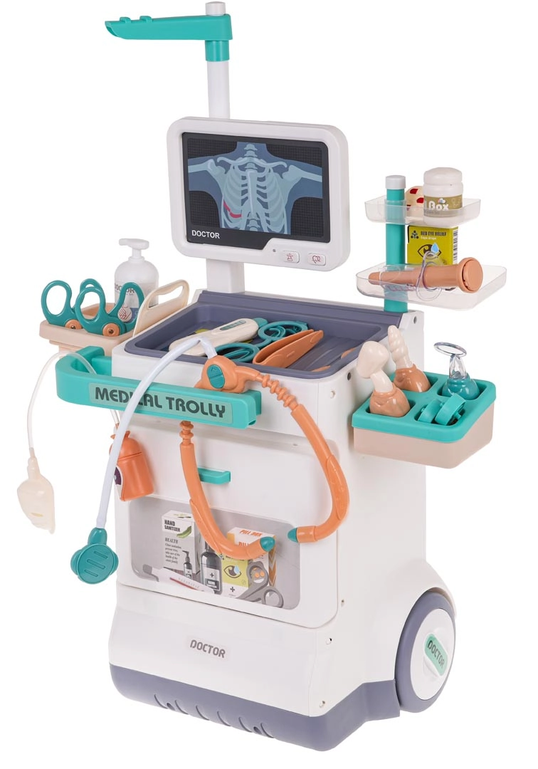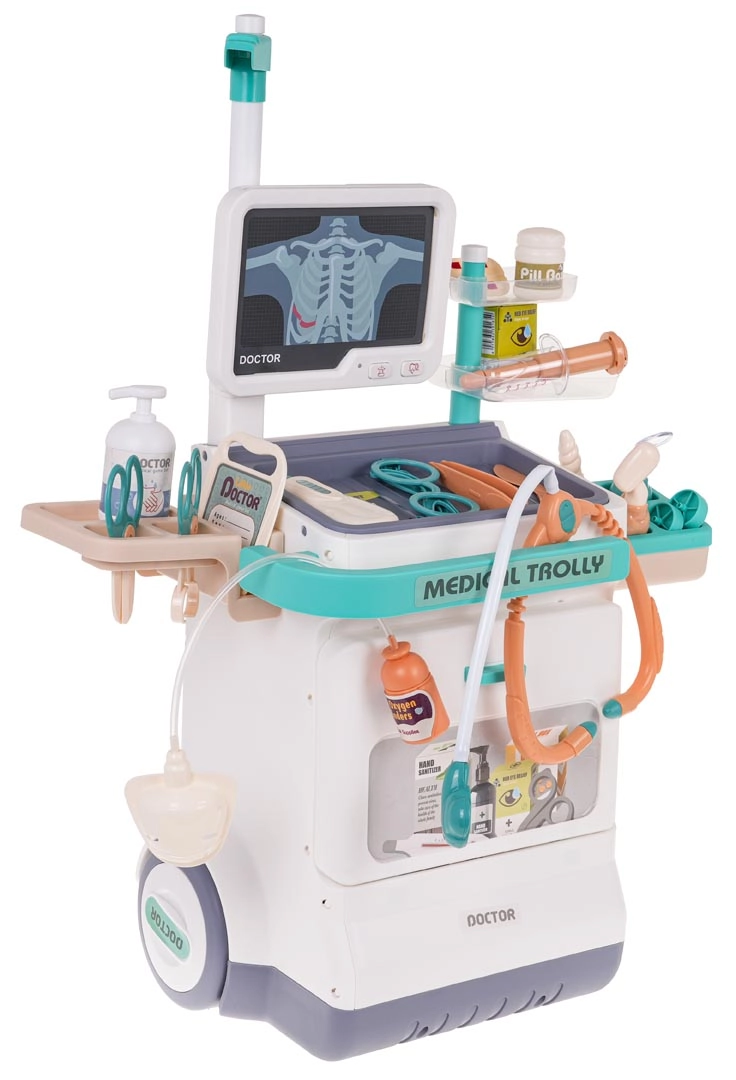 Αυτό το μαγικό ιατρικό καροτσάκι είναι ελαφρύ και εύκολο στον χειρισμό χάρη στους μεγάλους τροχούς και τη πρακτική λαβή. Το παιδί σας μπορεί να γίνει γιατρός, οφθαλμίατρος, καρδιολόγος ή οδοντίατρος. Το σετ περιλαμβάνει πίνακα με οθόνη, που μιμείται ήχους καρδιακού παλμού και συναγερμού, και μπορείτε να αλλάζετε εικόνες ΗΚΓ και ακτινογραφιών. Κατάλληλο για παιδιά από 3 ετών.
