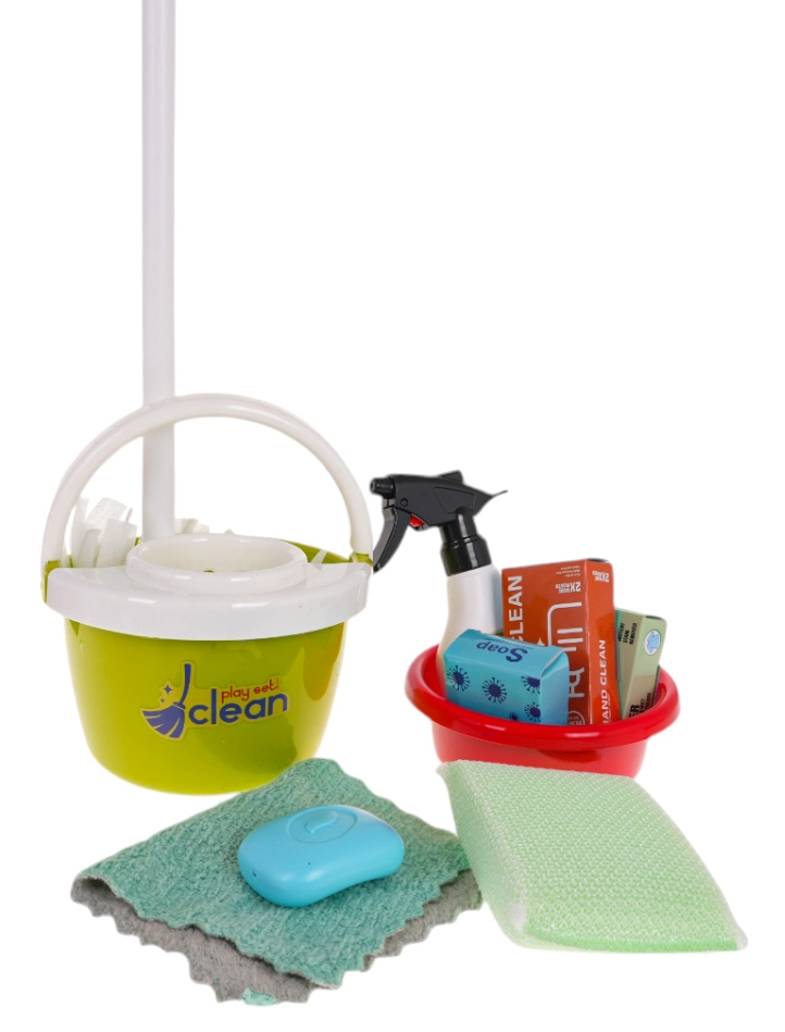 Σύνολο 29 τεμαχίων, συμπεριλαμβανομένων σφουγγαρίστρας, σκούπας, σφουγγαριών, ψεκαστήρα, κουβά και άλλων χρήσιμων αξεσουάρ για ρεαλιστικό παιχνίδι.
