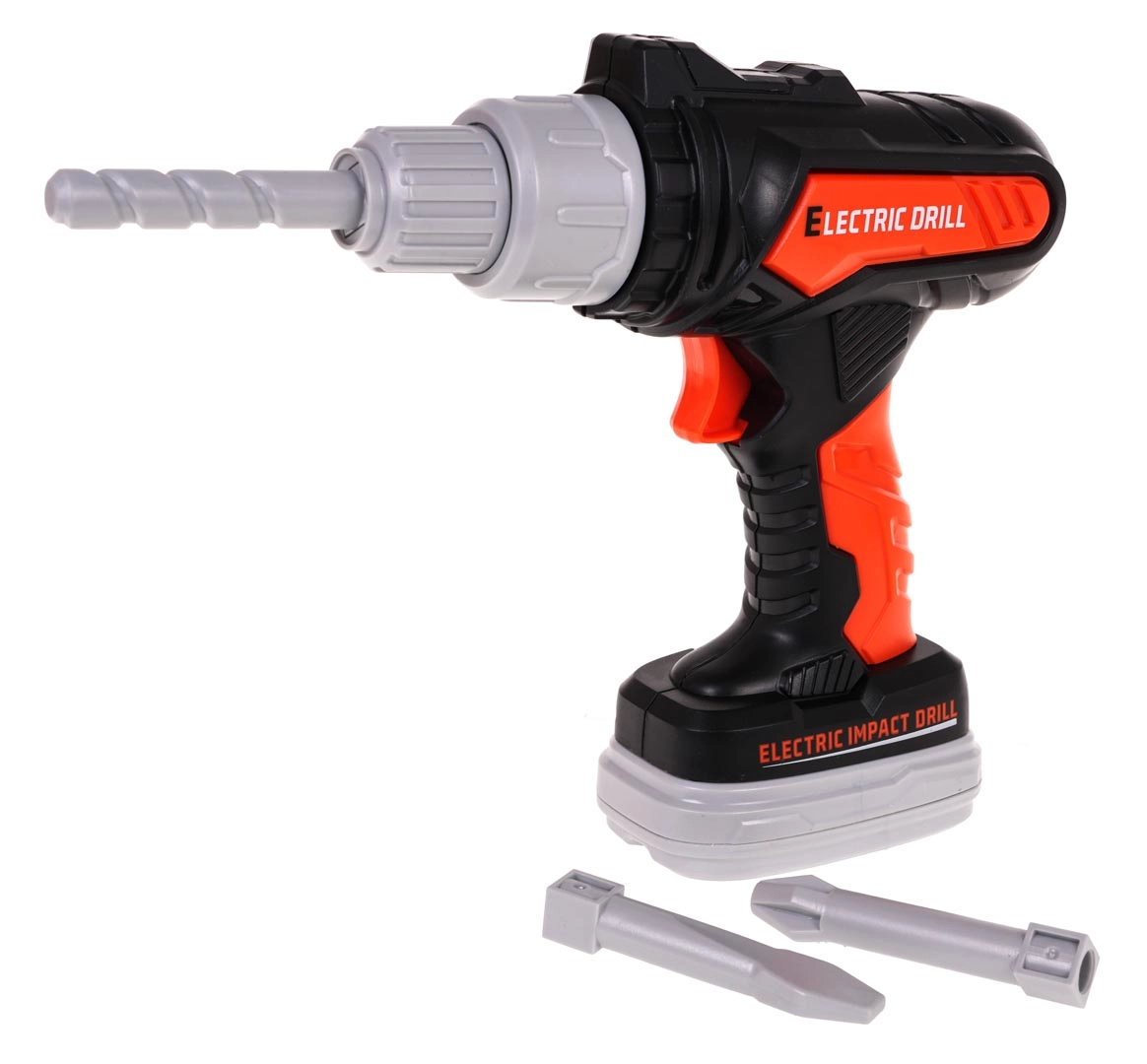Παιδικό τρυπάνι/κατσαβίδι με 2× AA μπαταρίες, με αφαιρούμενη «μπαταρία» και επιλογή κατεύθυνσης περιστροφής για βίδωμα και ξεβίδωμα. Περιλαμβάνονται εναλλάξιμα μπιτ: σταυροκατσάβιδο, ίσιο και τρυπάνι.