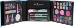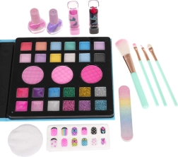 - Αναδιπλούμενο κουτί· παλέτα (15 σκιές, 12 βάλσαμα/κραγιόν)· 2× βερνίκι νυχιών· λίμα· 12× tips· 2× κραγιόν· 4× πινέλο· δίσκος ντεμακιγιάζ· καλλυντικός καθρέφτης