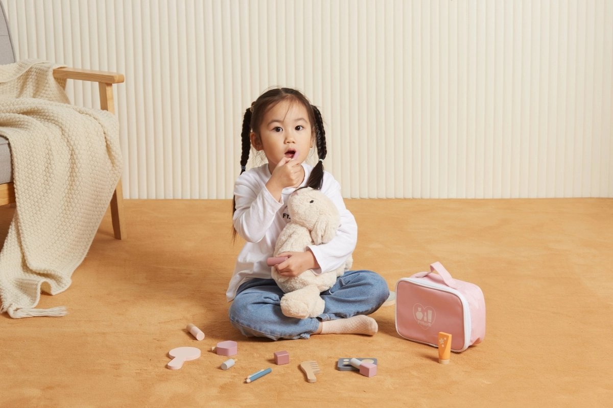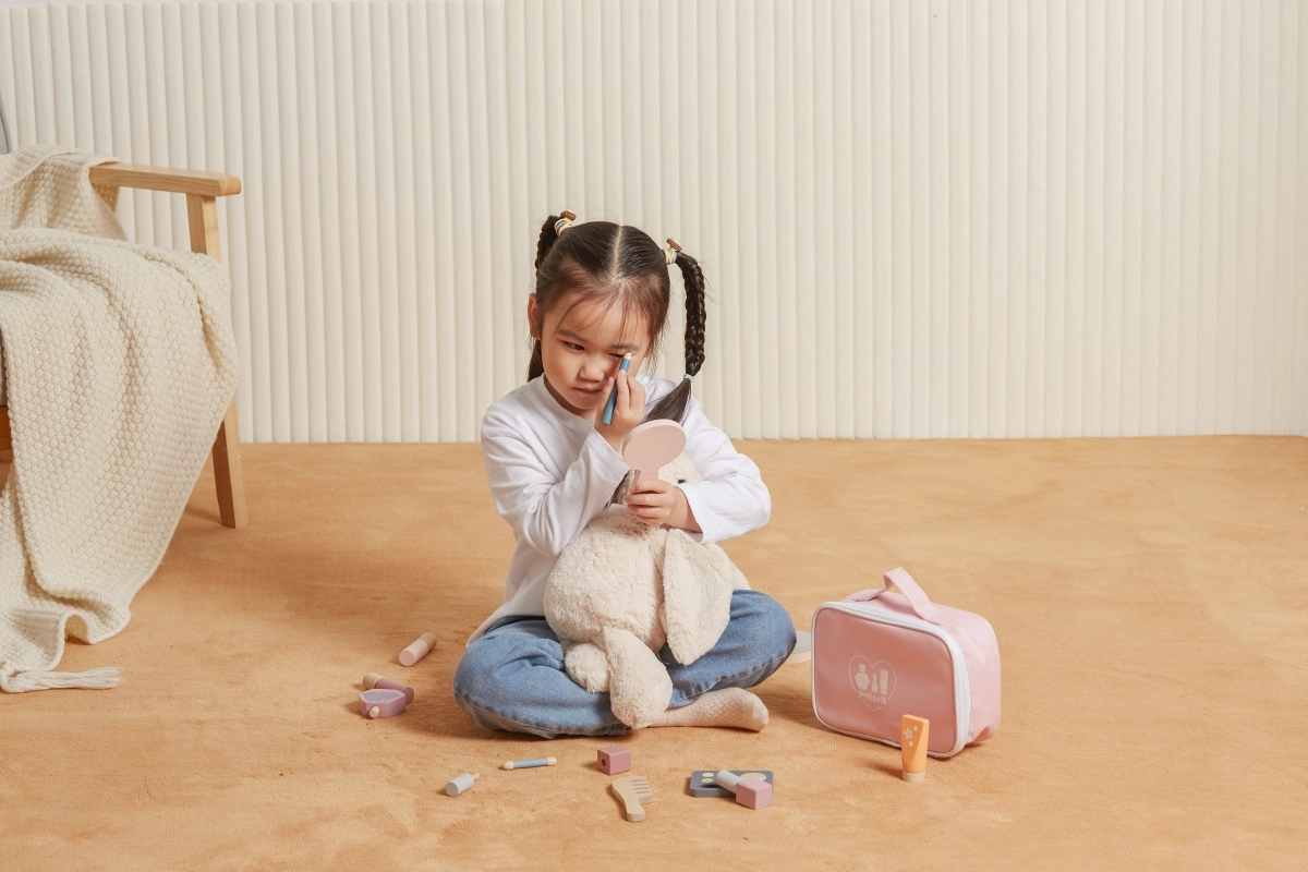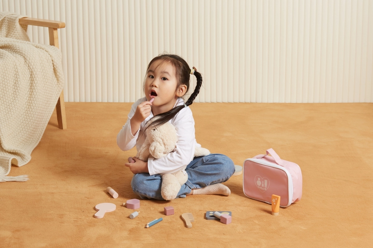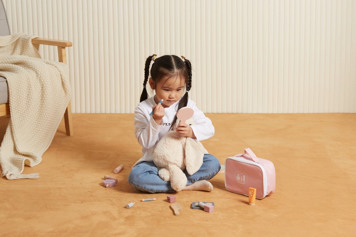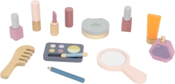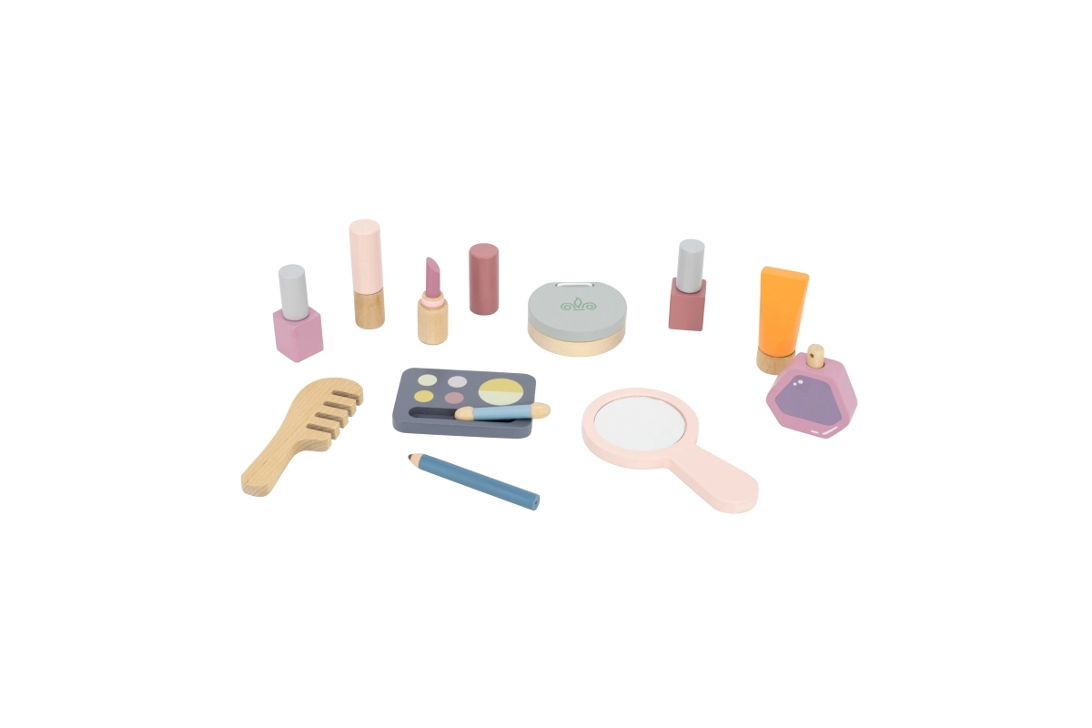 Το καθρεφτάκι, η παλέτα σκιών, τα βερνίκια, τα κραγιόν, το άρωμα και η χτένα είναι από ξύλο και λειτουργούν ως απομίμηση καλλυντικών – ιδανικά για ασφαλές και φανταστικό μακιγιάζ.