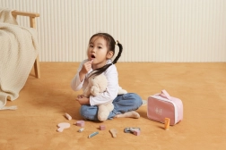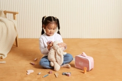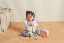 Χαρίστε στη μικρή μακιγιέρ το δικό της γωνάκι ομορφιάς. Η στιλάτη υφασμάτινη τσαντούλα κρατάει όλα τα ξύλινα “καλλυντικά” αξεσουάρ μαζί και επιτρέπει να τα πάρει παντού μαζί της. Το παιχνίδι καλλιεργεί τη λεπτή κινητικότητα, τη φαντασία και την ανάπτυξη κοινωνικών δεξιοτήτων μέσα από το παιχνίδι ρόλων.