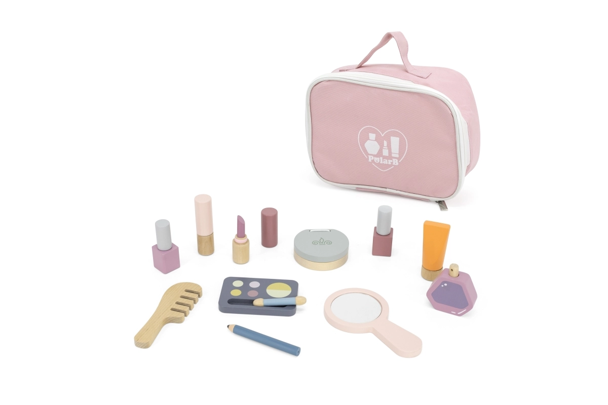 Το μαγικό ξύλινο σετ μακιγιάζ Viga PolarB στη πρακτική ροζ τσαντούλα προσφέρει στα παιδιά ώρες δημιουργικού και ευφάνταστου παιχνιδιού. Περιλαμβάνει καθρεφτάκι, παλέτα σκιών, πουδριέρα, 2 βερνίκια νυχιών, 2 κραγιόν, μπουκαλάκι αρώματος, χτένα και σωληνάριο – όλα από ποιοτικό ξύλο, απαλά επεξεργασμένα και ασφαλή για παιδιά.