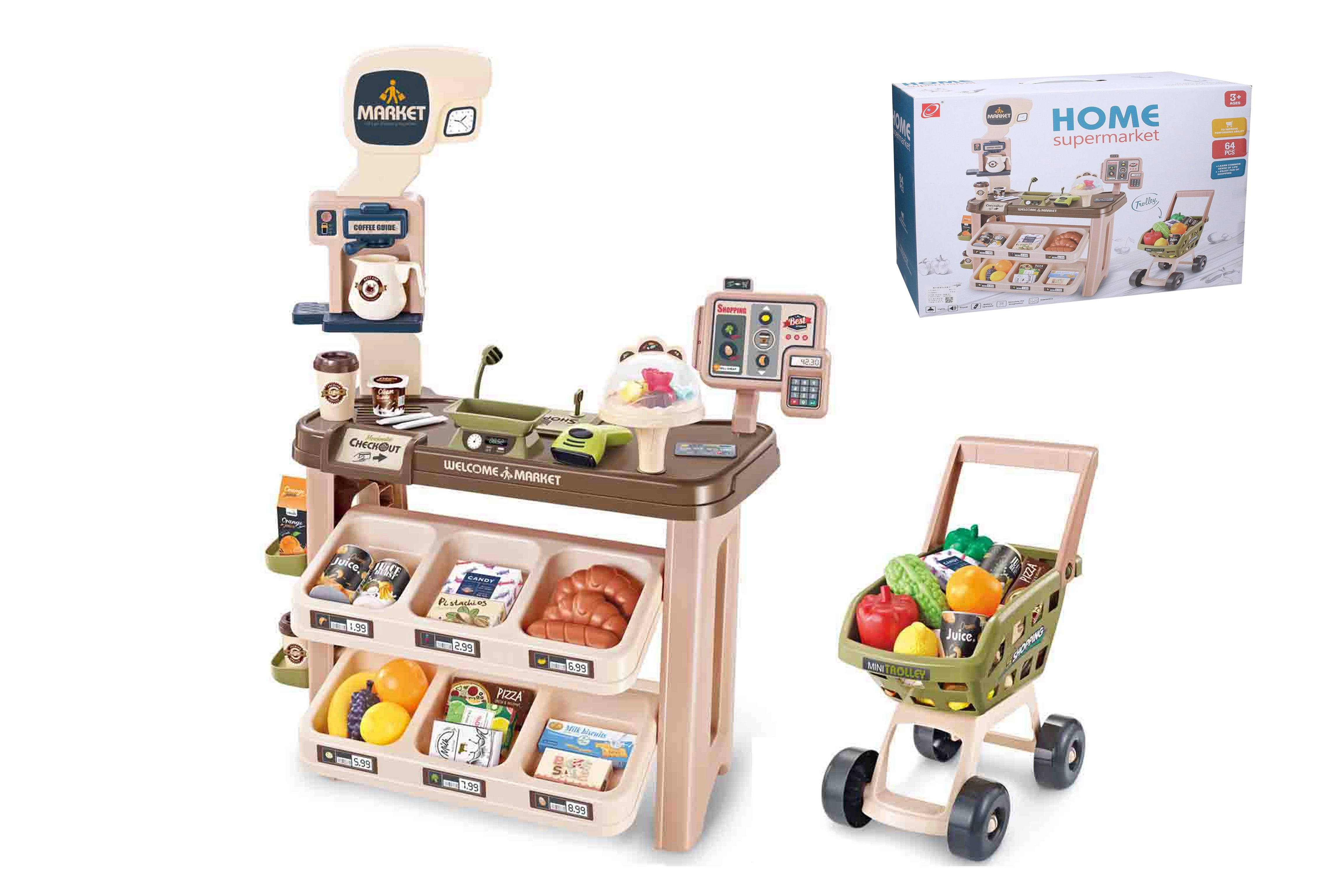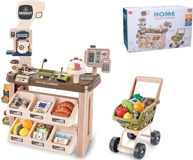 Περιλαμβάνονται πλούσια αξεσουάρ: ταμειακή μηχανή, σαρωτής γραμμωτού κώδικα, τερματικό πληρωμών, κάρτα πληρωμής, χαρτονομίσματα, κέρματα και καρότσι αγορών, ενώ δεν λείπουν φρούτα, λαχανικά, γάλα, καφές, χυμός, μπισκότα, πίτσα, ξηροί καρποί και άλλα τρόφιμα για ρεαλιστικό παιχνίδι. Τα ηλεκτρονικά μέρη είναι εύκολα στον χειρισμό χάρη στον διακόπτη ON/OFF που βρίσκεται στο κάτω μέρος του τερματικού πληρωμών.