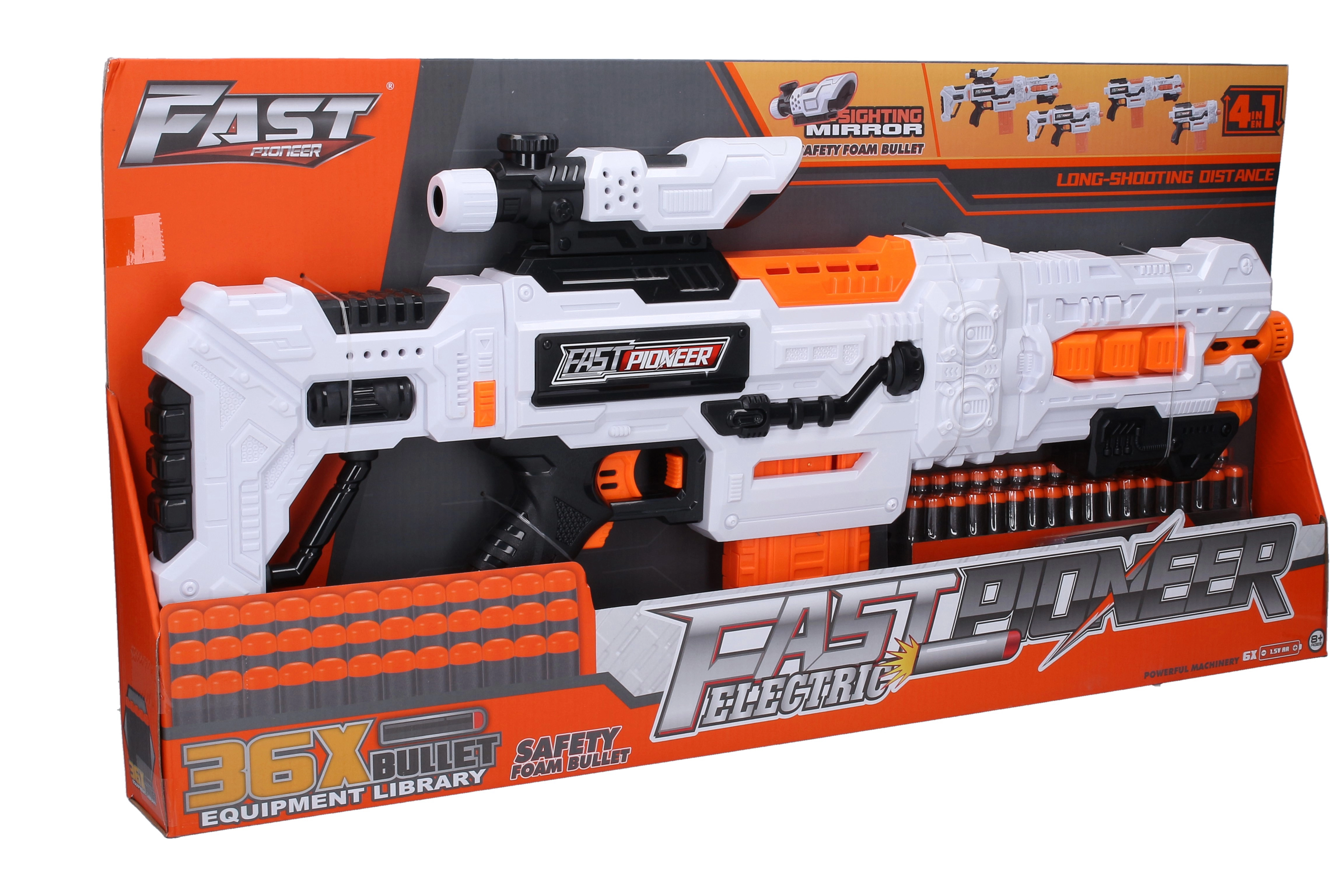 Διασκεδαστικό παιχνίδι δράσης για παιδιά και εφήβους: ηλεκτρικό αφρώδες πολυβόλο 4-σε-1 με εξαιρετική απόδοση, 36 αφρώδη βλήματα και δυνατότητα 4 διαφορετικών διαμορφώσεων. Εύκολος χειρισμός, ασφάλεια και γρήγορη αλλαγή γεμιστήρα για ατελείωτη διασκέδαση μέσα και έξω.