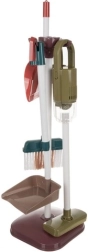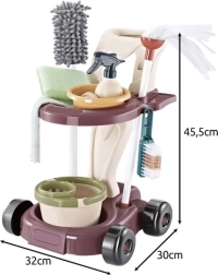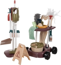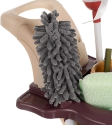 Ο έξυπνος σχεδιασμός επιτρέπει να είναι όλα τα αξεσουάρ πάντα στη θέση τους: κάτω ο κουβάς με στίφτη για τη σφουγγαρίστρα, πάνω το μπωλ, ο ψεκαστήρας και η ξύστρα νερού. Ειδικές οπές και γάντζοι κρατούν τη σφουγγαρίστρα, το ξεσκονόπανο και τα πανάκια, ενώ η σταθερή βάση οργανώνει με τάξη τη σκούπα, το σκουπάκι και τα φαράσια. Το παιχνίδι καθαρισμού καλλιεργεί την υπευθυνότητα, τη λεπτή κινητικότητα και την αίσθηση τάξης.