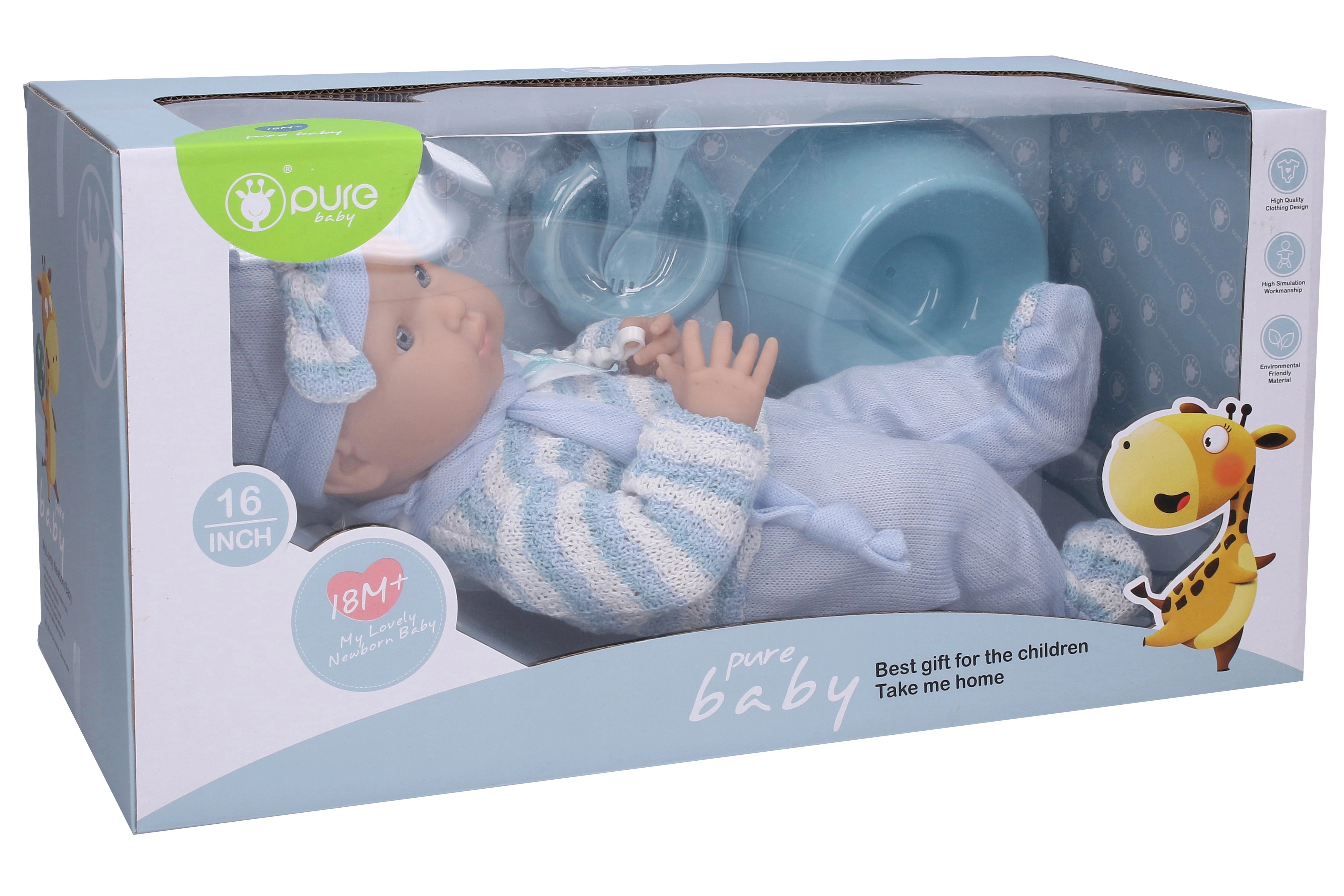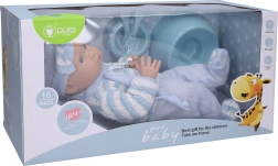 Χαριτωμένο μωρό με μπλε ολόσωμη φόρμα σε μέγεθος 40 cm που θα χαρίσει χαρά σε κάθε παιδί. Στη συσκευασία περιλαμβάνονται πρακτικά αξεσουάρ για παιχνίδι φροντίδας – γιογιό, μπολ με μαχαιροπίρουνα και πιπίλα. Ιδανικό για την ανάπτυξη της φαντασίας και των δεξιοτήτων φροντίδας.
