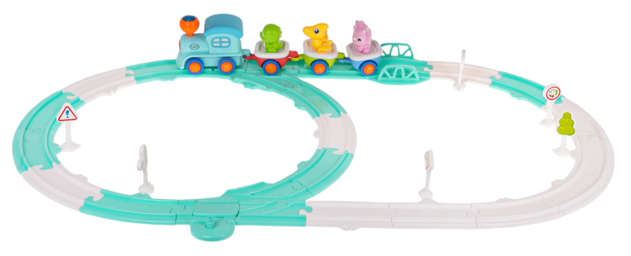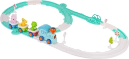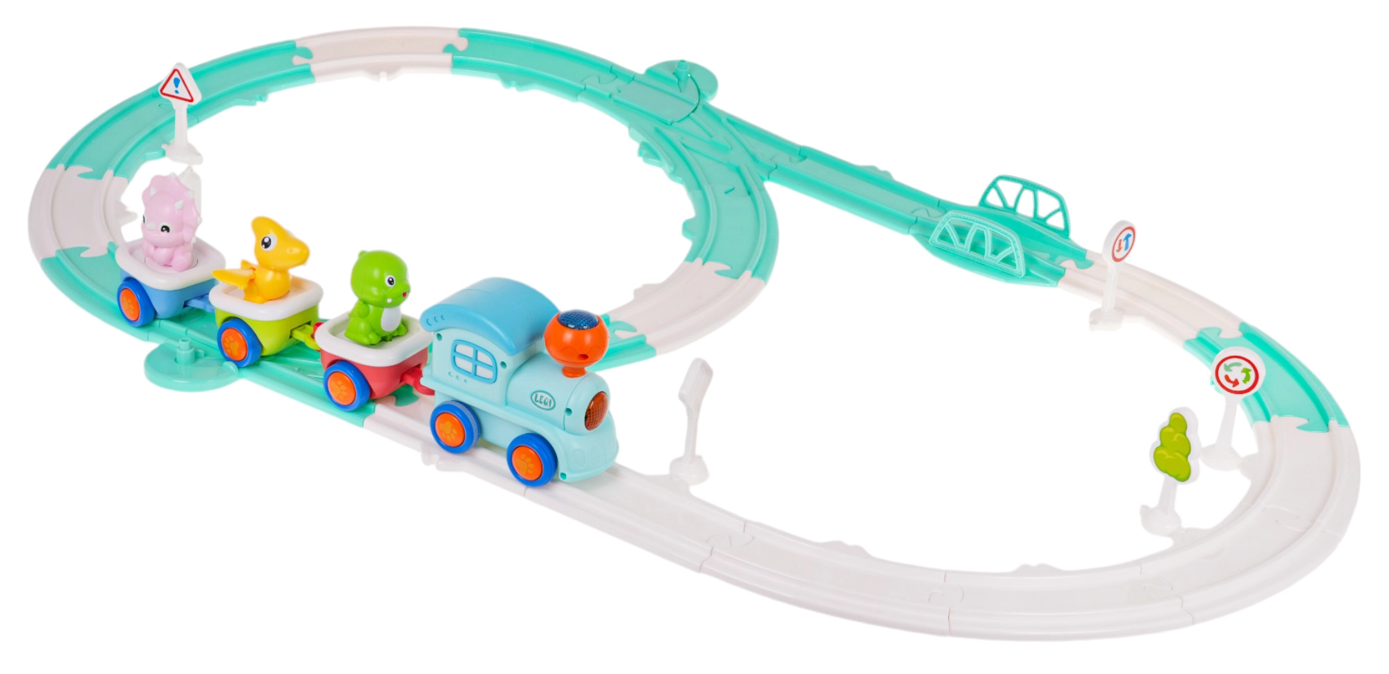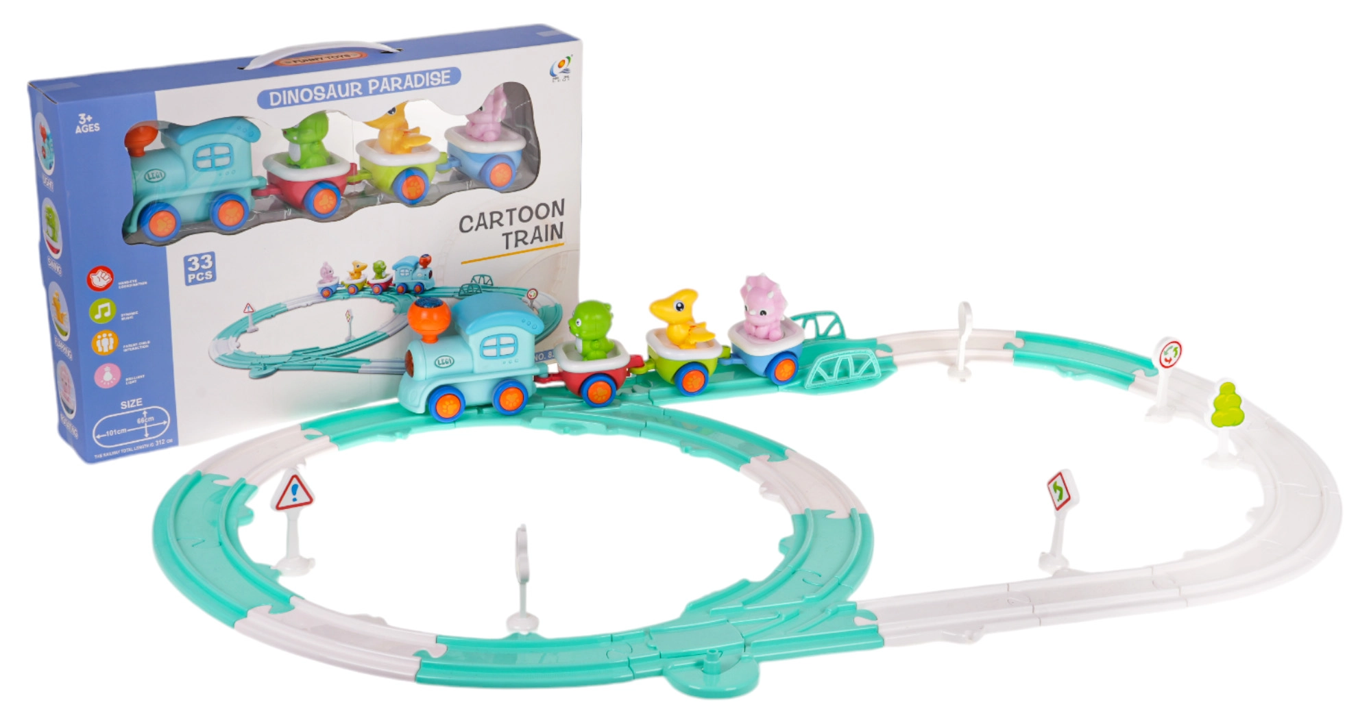 Απελευθερώστε τη φαντασία με την παιδική σιδηροτροχιά με δεινόσαυρους – ένα πολύχρωμο σετ με 33 κομμάτια για παιδιά από 3 ετών. Η μπαταριοκίνητη μηχανή προσφέρει φωτεινά εφέ και χαρούμενες μελωδίες, ενώ τρία αποσπώμενα βαγονάκια μεταφέρουν χαριτωμένες φιγούρες δεινοσαύρων. Οι εύκολες στη συναρμολόγηση ράγες, οι οδικές πινακίδες και η γεφυρούλα ενισχύουν το δημιουργικό παιχνίδι και τη μάθηση κανόνων.