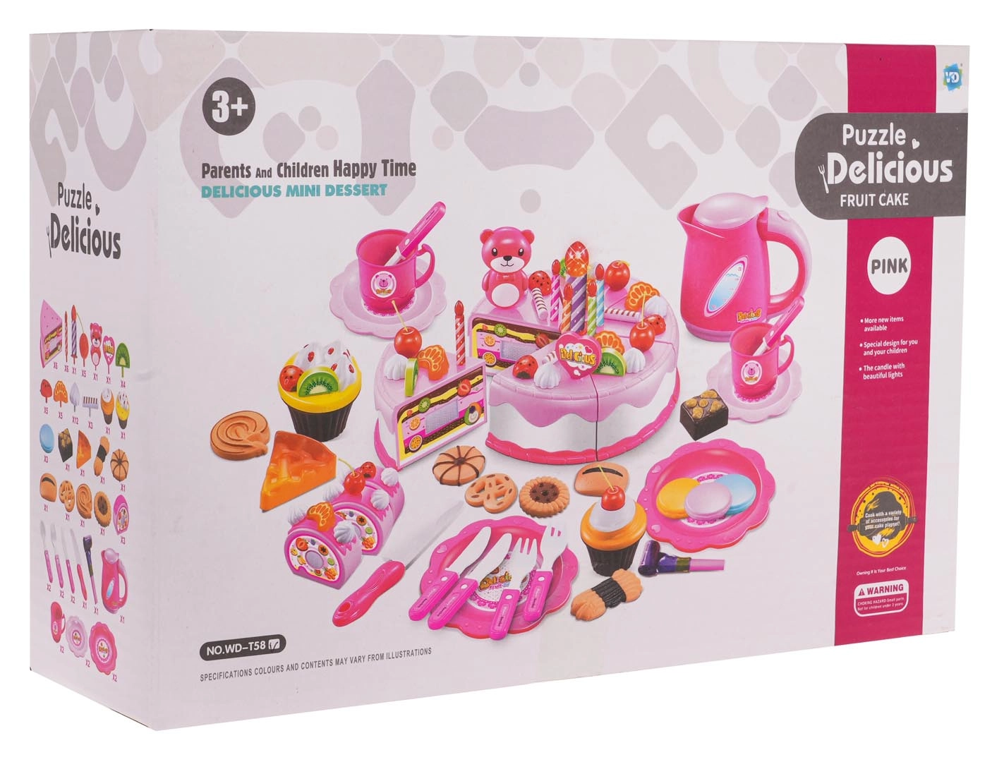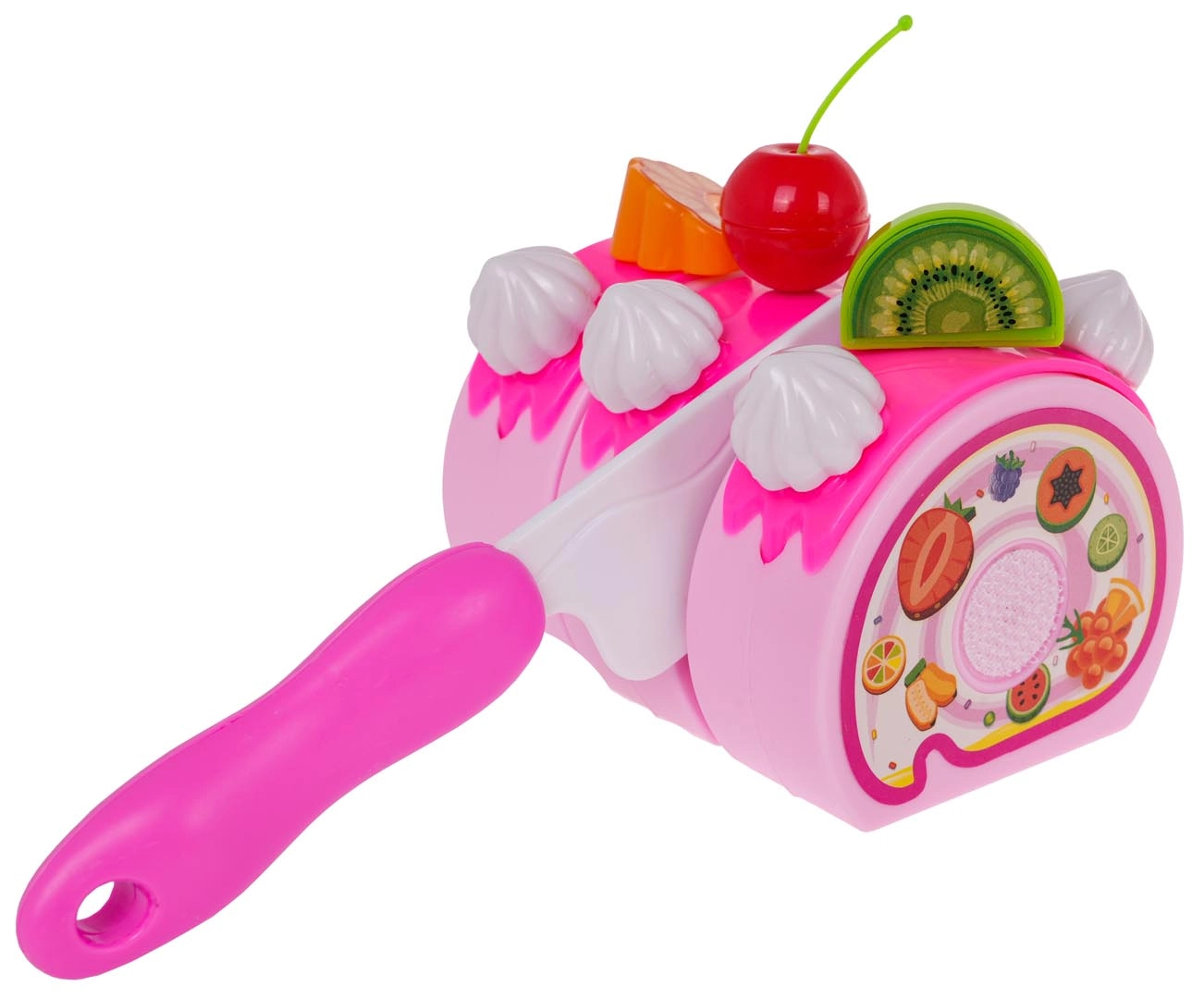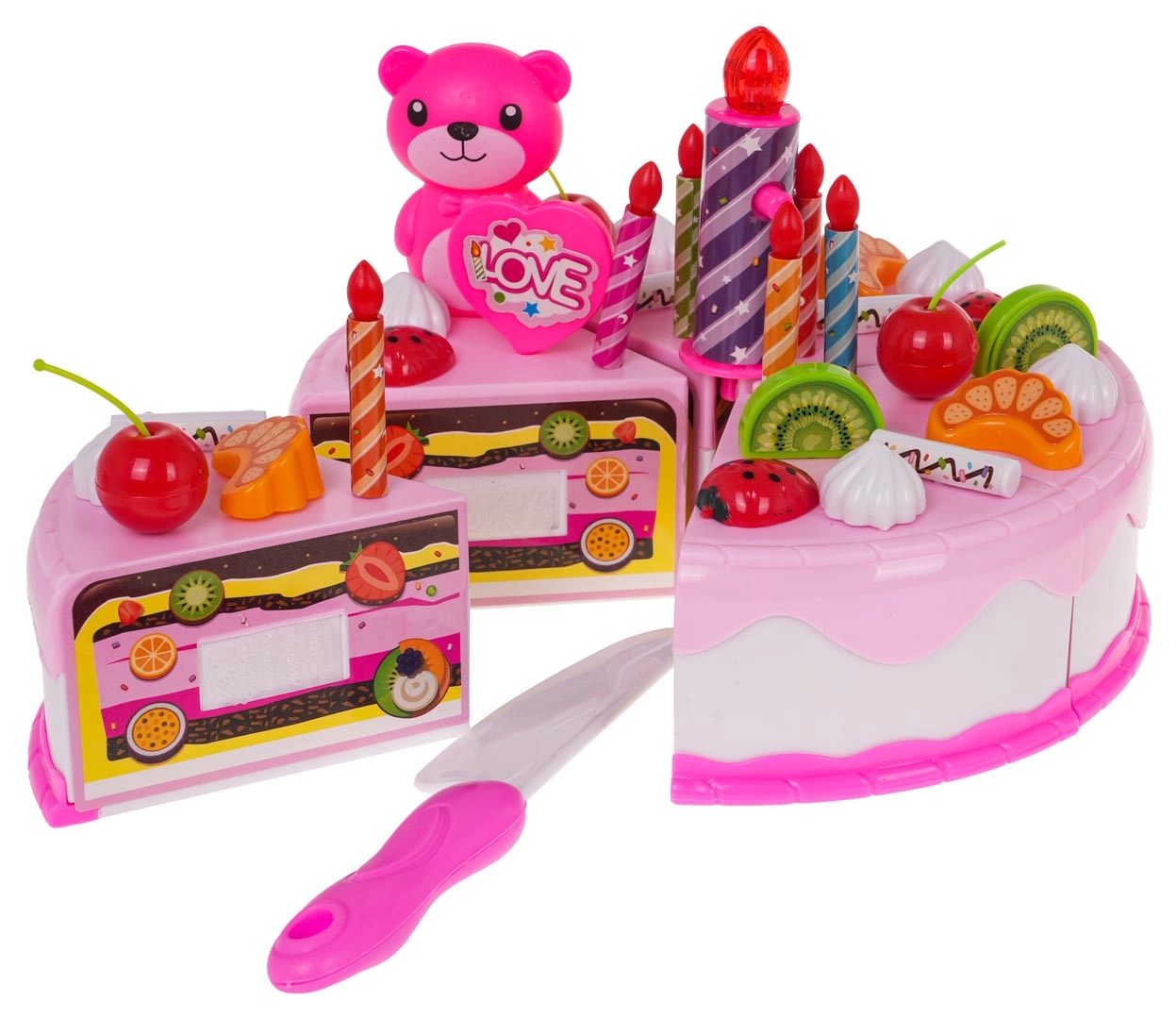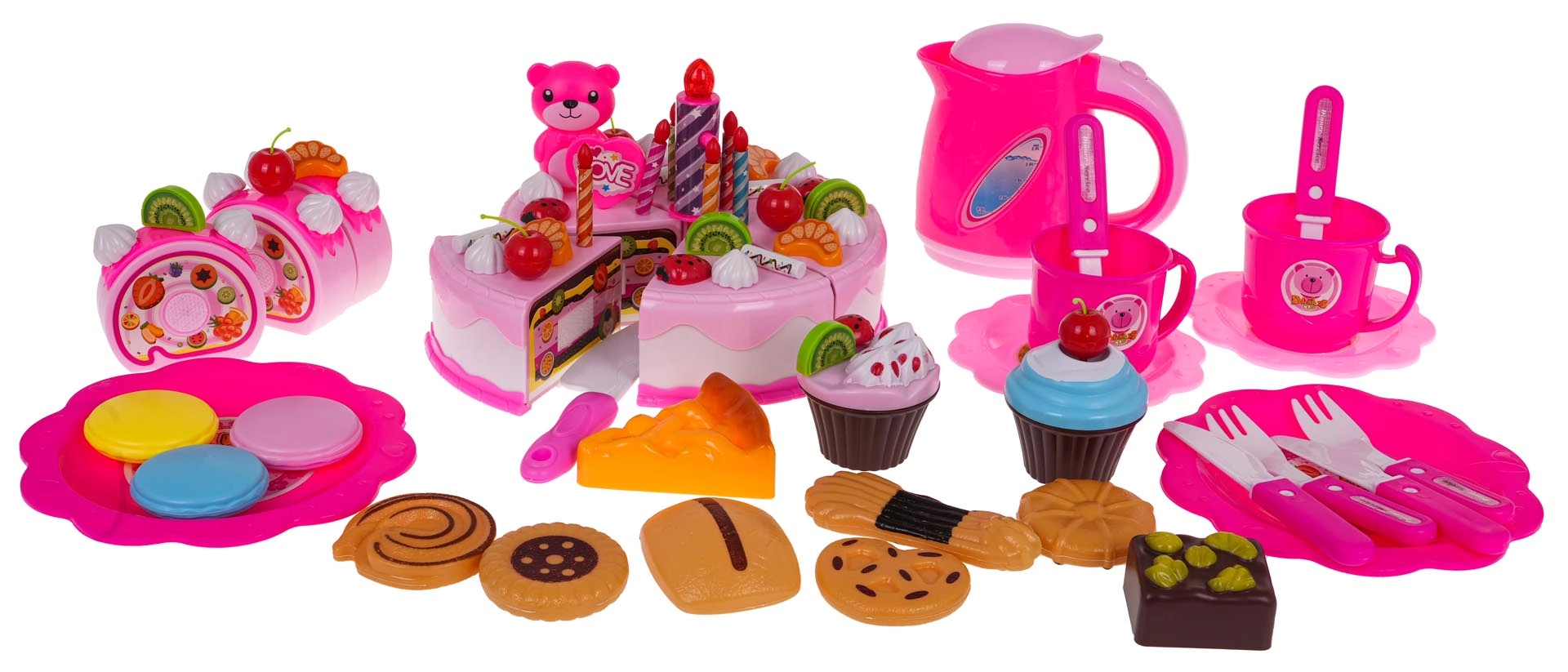 Αυτό το πλούσια εξοπλισμένο ροζ σετ γενεθλίων μεταμορφώνει το δωμάτιο σε μικρό ζαχαροπλαστείο. Η εξακομμάτια τούρτα ενωμένη με βέλκρο μπορεί να «κοπεί» με το παρεχόμενο μαχαίρι και να διακοσμηθεί με φρούτα, μπισκότα και χαριτωμένα αξεσουάρ. Το μεγάλο κερί ανάβει με δύο χρώματα με το πάτημα ενός κουμπιού (οι μπαταρίες RL41 περιλαμβάνονται), προσθέτοντας μαγική ατμόσφαιρα στη γιορτή.
