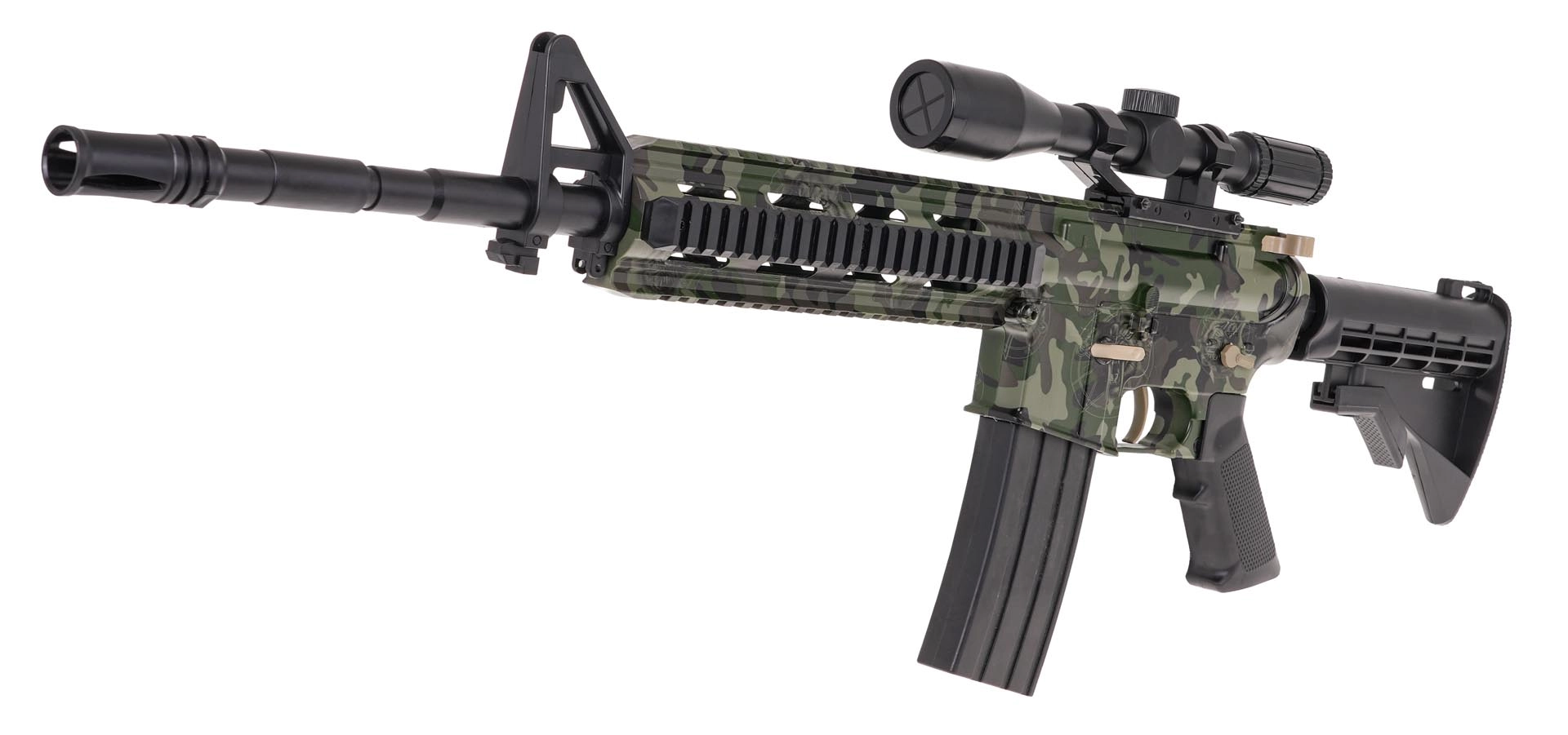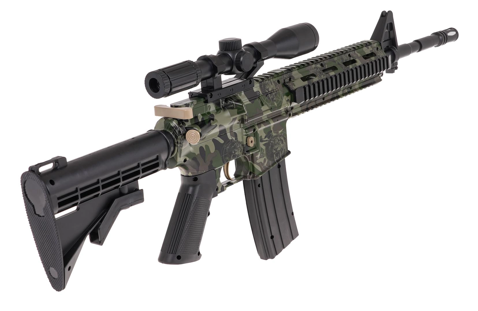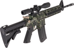 Μεγάλη, τακτική καραμπίνα M4 για ζελατινώδεις σφαίρες, ιδανική για παιχνίδια σε εξωτερικούς χώρους και εξάσκηση ακρίβειας. Χάρη στις δύο λειτουργίες βολής απολαμβάνετε τόσο γρήγορη δράση όσο και ακριβείς μονές βολές. Το παρεχόμενο οπτικό σκοπευτικό με μεγέθυνση ρυθμίζεται λεπτά με περιστροφικό χειριστήριο ώστε ο στόχος να βρίσκεται πάντα στο σταυρόνημα.