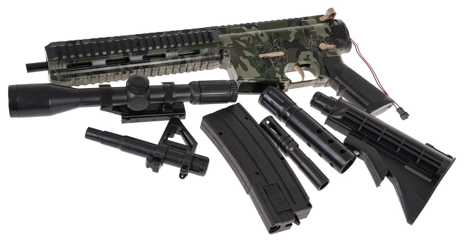 - καραμπίνα, γεμιστήρας, κάννη, σιγαστήρας, σκοπευτικό, κοντάκι, καλώδιο USB, μπαταρία 7,4 V, σακουλάκι με σφαίρες για προετοιμασία, ιμάντας, προστατευτικά γυαλιά, οδηγίες (EN), συσκευασία δώρου