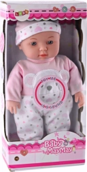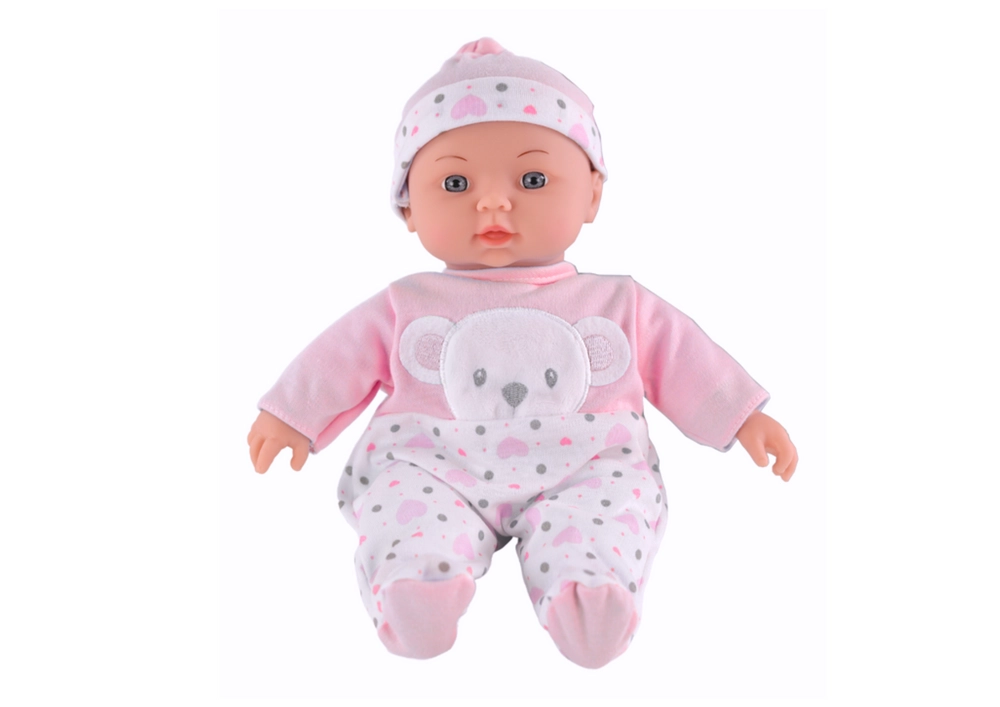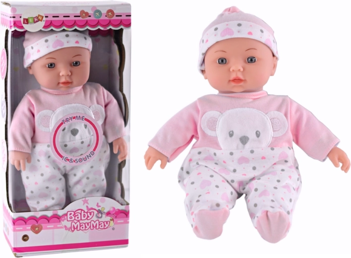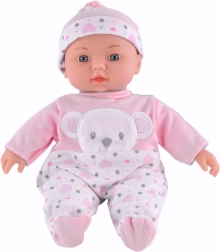 Χαριτωμένο κουκλάκι μωρό με ροζ φορμάκι με αρκουδάκι και σκουφάκι που θα χαροποιήσει κάθε παιδί. Με το πάτημα της μαλακής κοιλίτσας παράγει ρεαλιστικούς ήχους μωρού, ενισχύει το δημιουργικό παιχνίδι, τη φροντίδα και την υπευθυνότητα. Κατασκευασμένο από ασφαλή υλικά, κατάλληλο από 12 μηνών, με πιστοποίηση CE και πρότυπο EN71.