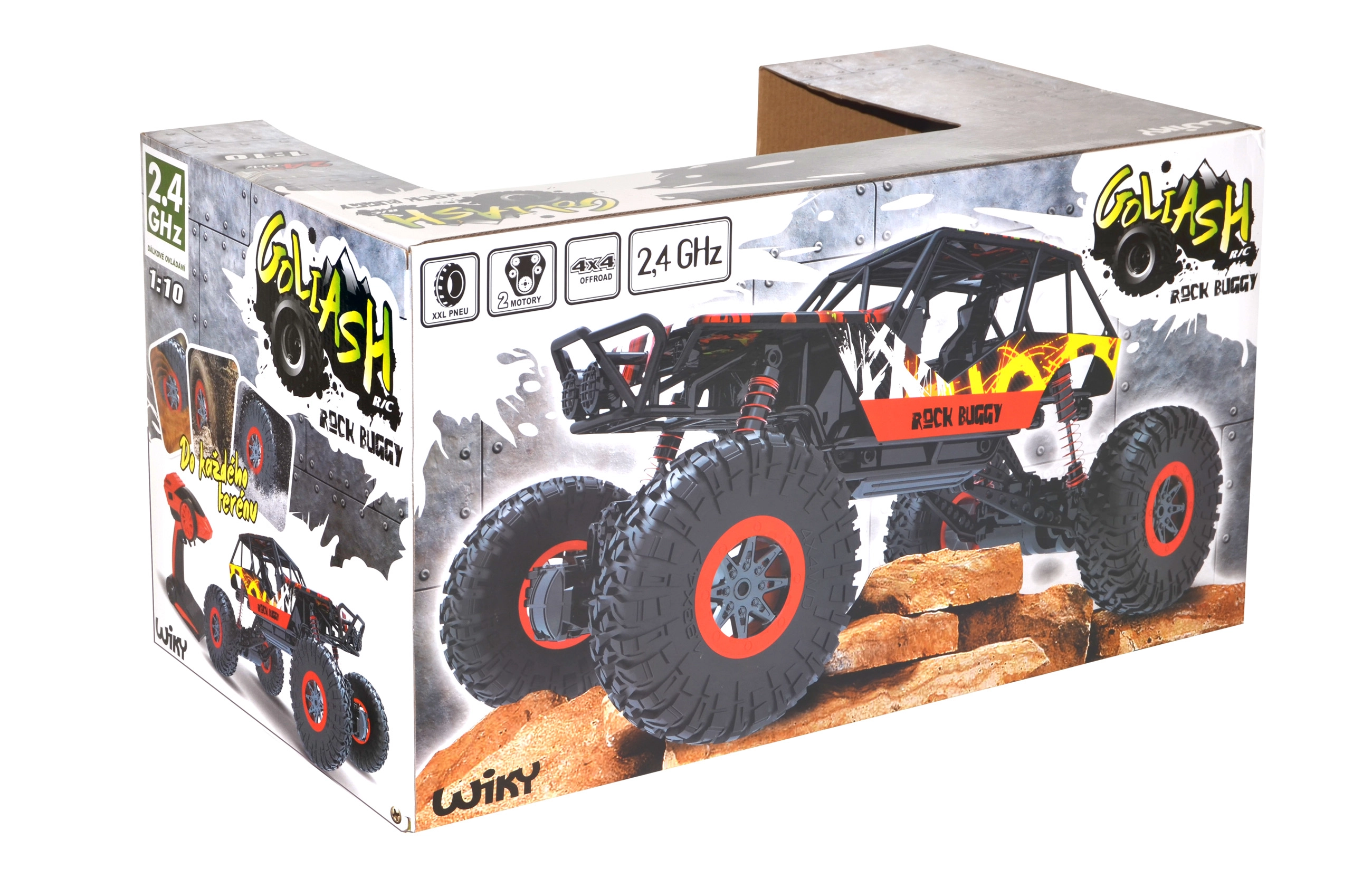 Το τετρακίνητο RC αυτοκίνητο Rock Buggy Goliash ανταποκρίνεται σε κάθε πρόκληση. Χάρη στην κίνηση 4x4, τα XXL ελαστικά με υψηλή πρόσφυση και την ανθεκτική ανάρτηση, τα καταφέρνει σε άμμο, χιόνι και λάσπη. Φτάνει ταχύτητα έως 10 km/h, διαθέτει εμπρόσθια LED φώτα και βελτιωμένο πομπό 2,4 GHz που δεν παρεμβάλλεται με άλλους. Ιδανική επιλογή για μικρούς και μεγάλους εξερευνητές.