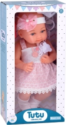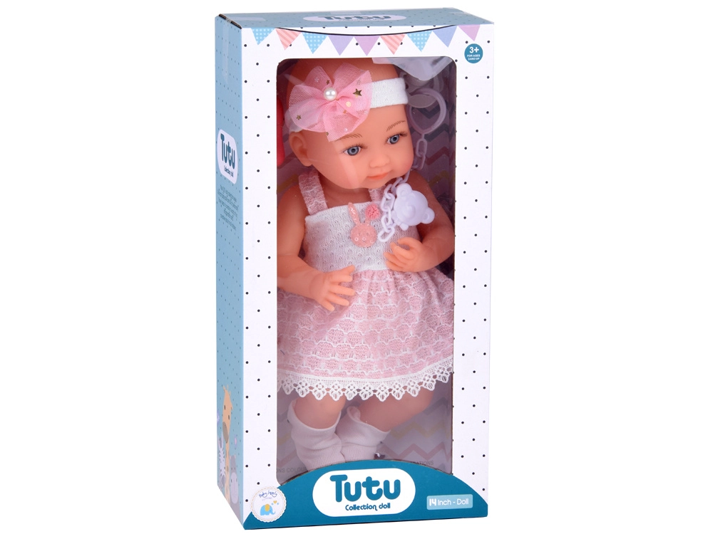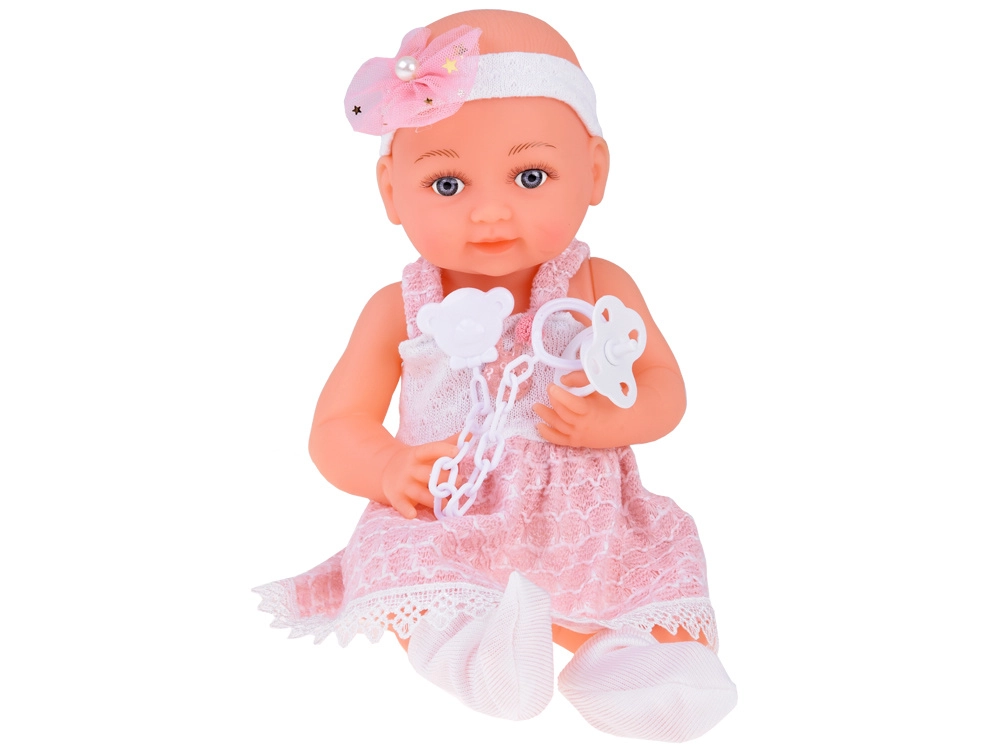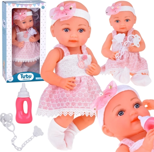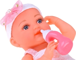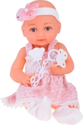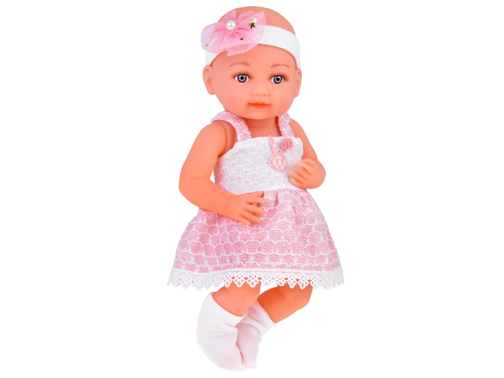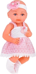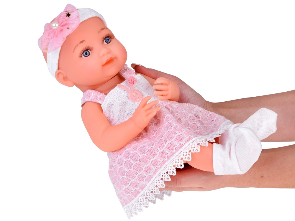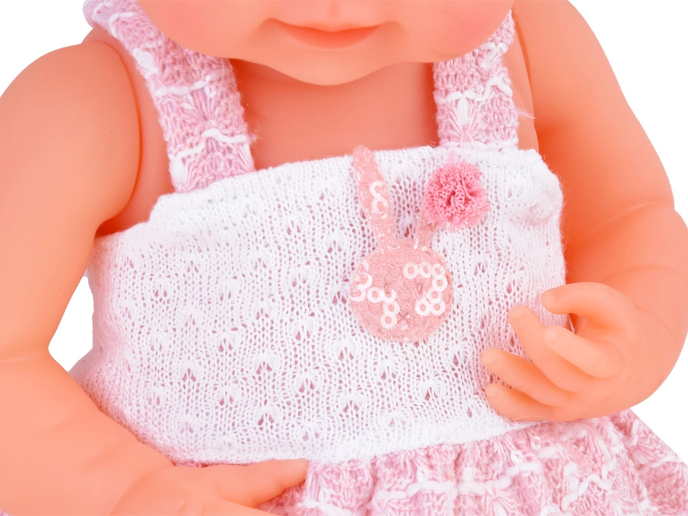 Αυτή η προσεγμένα κατασκευασμένη κούκλα από ανθεκτικό πλαστικό και ύφασμα εντυπωσιάζει με το λεπτομερές πρόσωπο, την τρυφερή έκφραση και το όμορφο σύνολο σε ροζ και λευκό. Το μωρό στολίζεται με κορδέλα που έχει φιόγκο και περλίτσα και φορά λευκές καλτσούλες. Τα μάτια δεν κλείνουν, αλλά χάρη στις έντονες βλεφαρίδες δείχνουν πολύ ζωντανά.