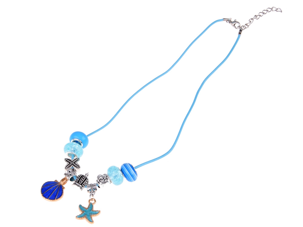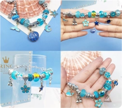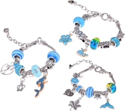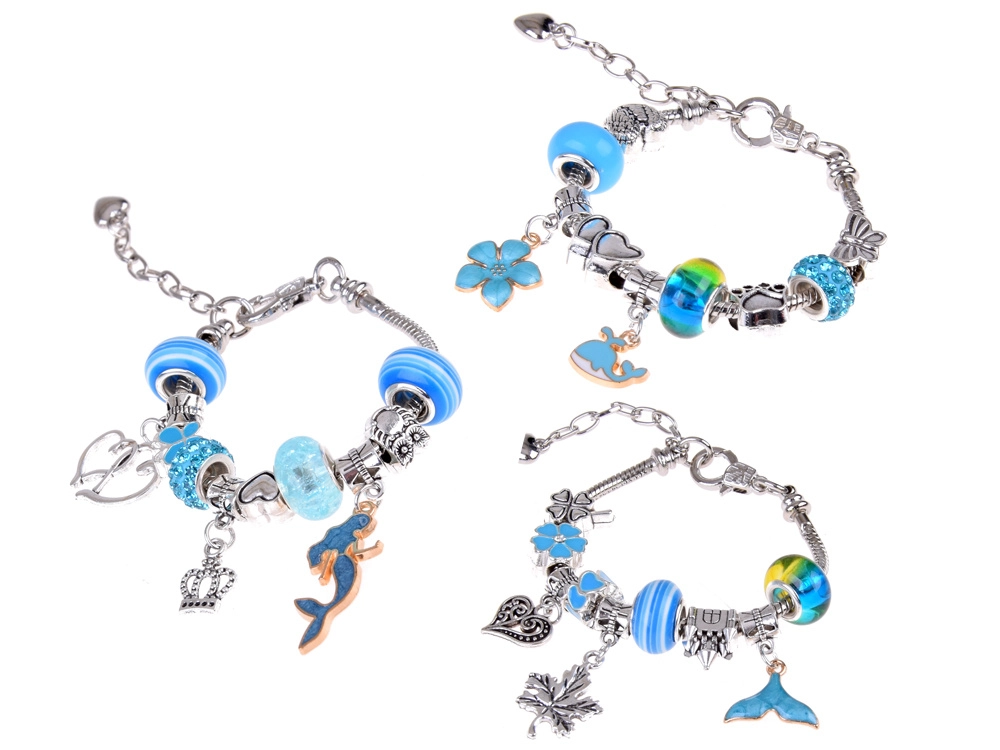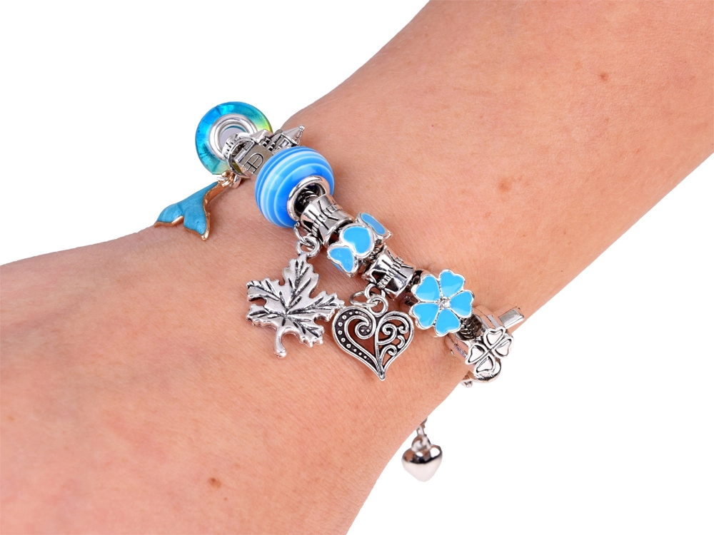 Ασημί‑μπλε χάντρες, μενταγιόν και αλυσίδες με μοτίβα θάλασσας, λουλουδιών και καρδιών – ατελείωτοι συνδυασμοί.