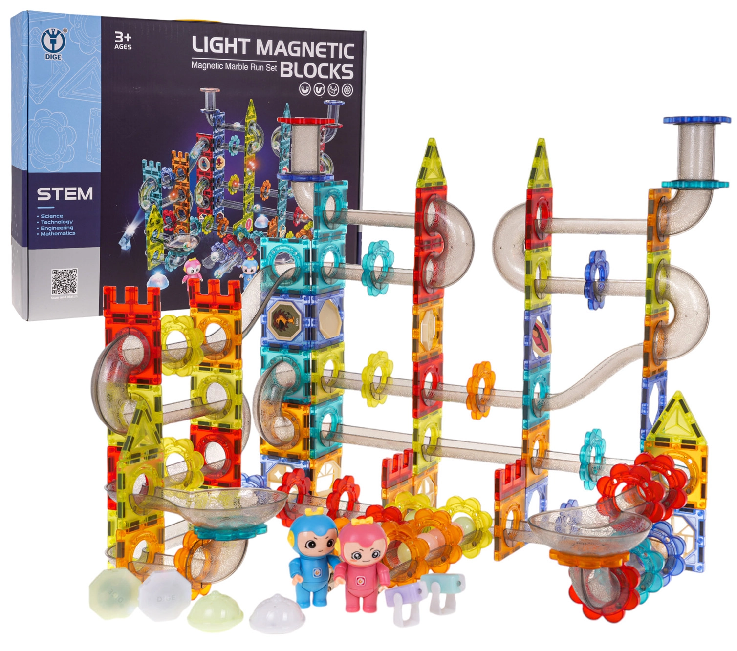 Τα φωτεινά στοιχεία δίνουν σε κάθε πίστα εντυπωσιακό εφέ – οι μπίλιες με διόδους αναβοσβήνουν όταν τις κουνήσετε, οι φωτιζόμενες κάψουλες αλλάζουν χρώματα και τα LED στοιχεία προσφέρουν 3 λειτουργίες (γρήγορη, μεσαία, αργή). Στη συσκευασία περιλαμβάνεται εικονιστικός οδηγός με ιδέες για κατασκευές, φιγούρες για παιχνίδι ρόλων και διακοσμητικά αυτοκόλλητα.