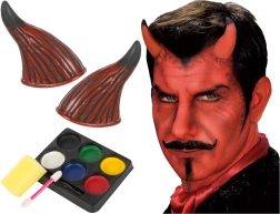 Ιδανικό για το Halloween, αποκριάτικα ή θεματικά πάρτι. Με αυτό το σετ μπορείτε να δημιουργήσετε μια τρομακτική αλλά και εντυπωσιακή εμφάνιση που θα τραβήξει τα βλέμματα. Εκτός από τα κέρατα και τα χρώματα, περιλαμβάνει επίσης τεχνητό αίμα για την ολοκλήρωση της διαβολικής εμφάνισης.