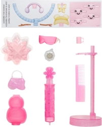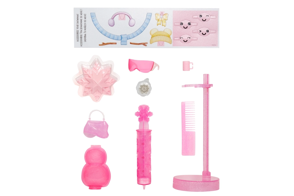 - κούκλα, βάση, χτένα, αξεσουάρ μόδας, μαγικό χιόνι για το outfit, σετ για χιονάνθρωπο με διαμορφώσιμο «χιόνι»