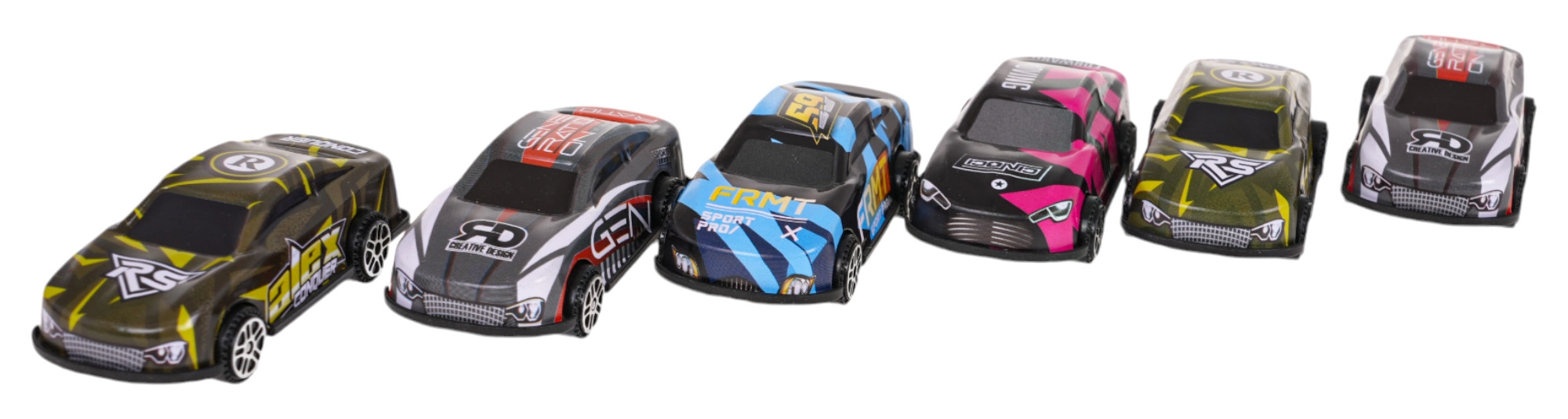 Στη συσκευασία περιλαμβάνονται έξι λεπτομερή οχήματα με μεταλλικό αμάξωμα και αεροδυναμικό σχεδιασμό, έτοιμα για αγώνα.