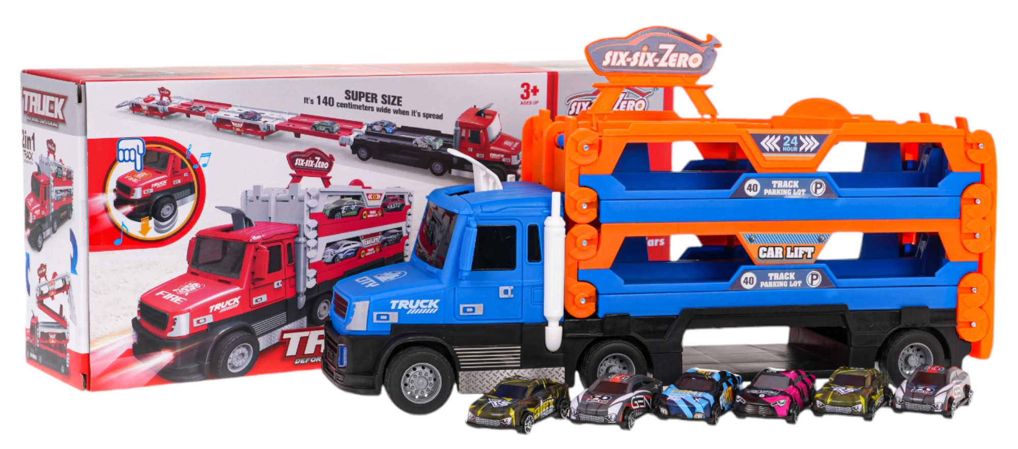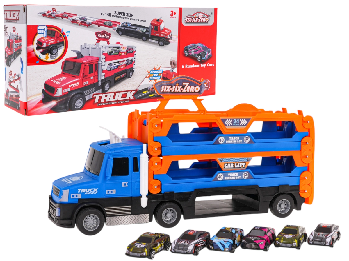 Διαδραστικό, τριών επιπέδων φορτηγό με καταπέλτη για παιδιά από 3 ετών προσφέρει αποθήκευση και αγώνες σε ένα. Όταν ξεδιπλωθεί, μετατρέπεται σε μακρά αγωνιστική πίστα έως 140 cm και χάρη στα λάστιχα από καουτσούκ είναι σταθερό στην κίνηση. Περιλαμβάνει 6 μεταλλικά αυτοκινητάκια (1:64), φωτεινά και ηχητικά εφέ και εκτοξευτή για δυναμικό παιχνίδι.