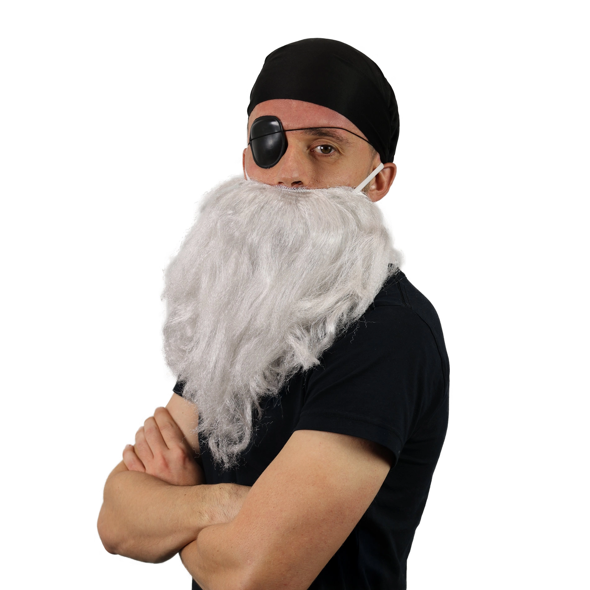 Τα μακριά λευκά γένια και το μαύρο κάλυμμα ματιού δημιουργούν έναν έντονο πειρατικό χαρακτήρα χωρίς πολύπλοκο μακιγιάζ.