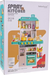 - Φωτεινά εφέ καυστήρων, ήχοι μαγειρέματος και τηγανίσματος, ασφαλής υδάτινος ατμός, τρέχον νερό από τη βρύση, περιστρεφόμενα κουμπιά, ανοιγόμενα «ψυγείο» και φούρνος