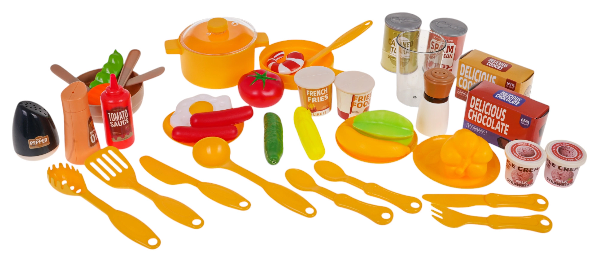 - Κουζίνα, τηγάνι, κατσαρόλα με καπάκι, μπολ, μαχαιροπίρουνα και σκεύη, πιάτα, μπαχαρικά, σάλτσες, κούπα, επιδόρπια, κονσέρβες, αξεσουάρ fast food, ομοιώματα τροφίμων (πιπεριά, ντομάτα, φύλλο σαλάτας, φέτες καρότου και πιπεριάς, γαρίδα, αυγό μάτι, λουκάνικα, μπανάνα, αρακάς, αγγούρι)